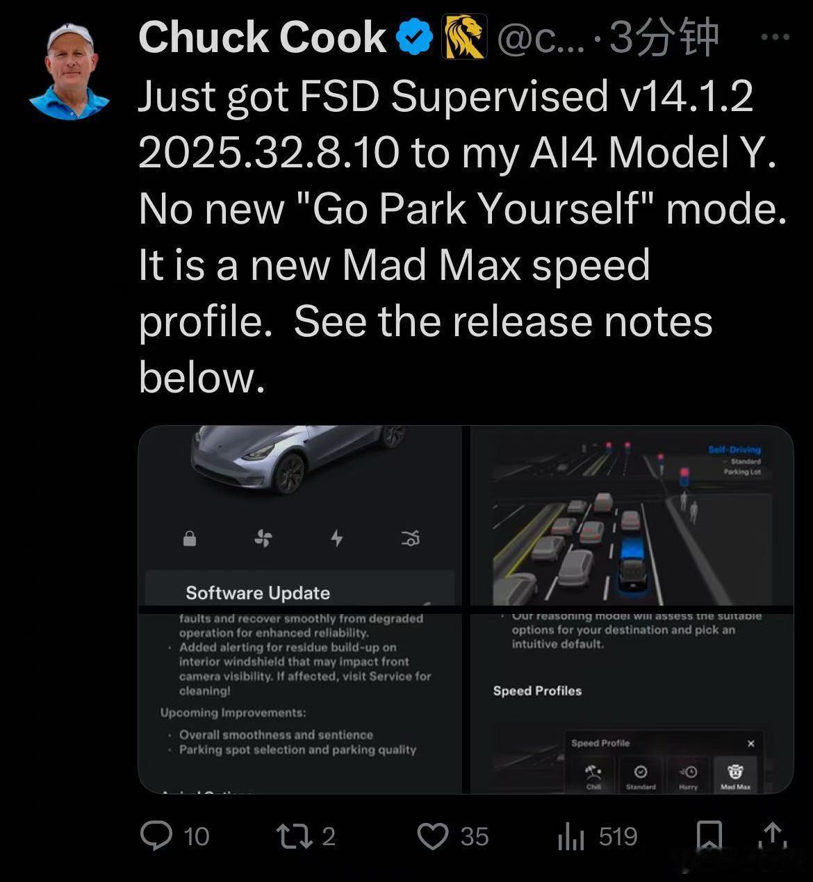 特斯拉 FSD v14 的最新版增加了一个“疯狂的麦克斯”模式,应该是超强博弈模式,听起来很香啊