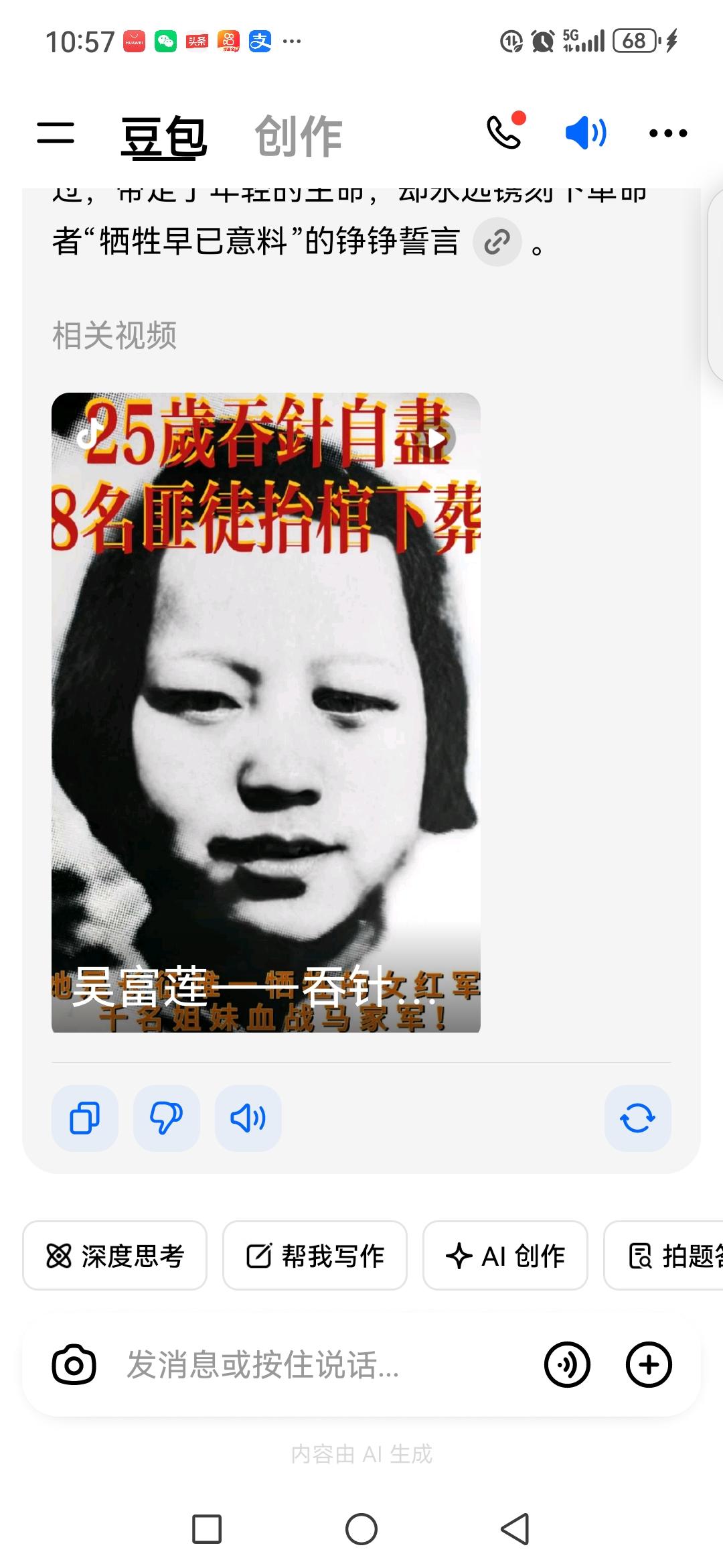 1937年冬天,被抓的女红军吴富莲躺了三天牢房,半夜忽然嚼断了根钢针,狱卒进时来。寒狱针魂 1937年寒冬,凉州监狱的木板床承载着25岁的女红军吴富莲。三天来,敌人的威逼利诱与严刑拷打,都没能撼动这位妇女先锋团政委的意志,她以绝食抗争,只剩微弱气息 。 寒夜深沉,牢内响起细碎的金属撞齿声。吴富莲攥紧藏了许久的脱衣钢针,那是她留给自己最后的武器。为保气节不受辱,她猛地将针吞入腹中,剧痛让鲜血浸透囚衣,却未发出半声呻吟。 天微亮时,狱卒推门而入,只见她直挺挺躺着,面色蜡黄却目光未散。那枚钢针穿肠而过,带走了年轻的生命,却永远镌刻下革命者“牺牲早已意料”的铮铮誓言 。作品声明内容谢材于网络。
