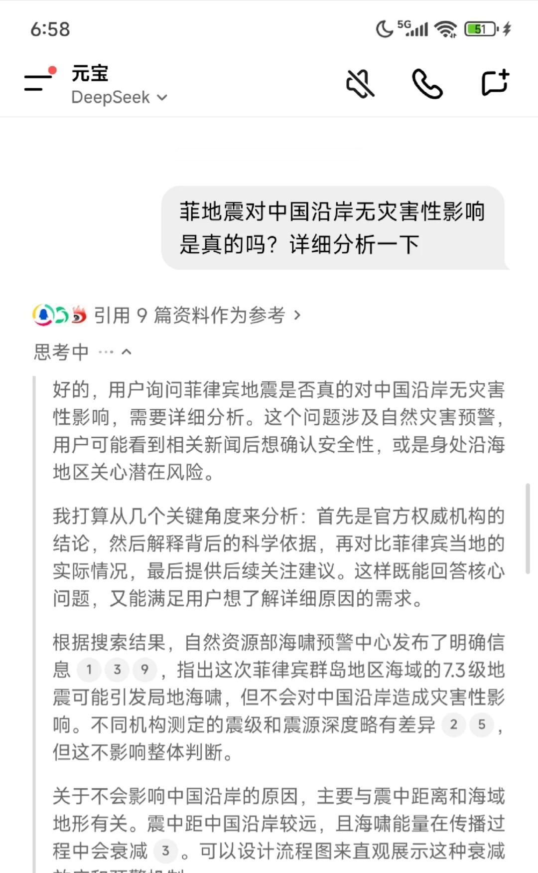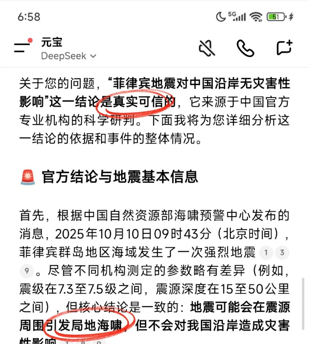 菲律宾强震对中国沿岸影响确认!快来看看吧 今天清晨被菲律宾7级地震的消息刷屏,不少沿海的朋友都在问:会有海啸影响吗?海浪会冲到国内吗? 打开元宝里的deepseek一下,根据官方权威回应,本次地震不会对我国沿岸造成灾害性影响!虽然震级较强,但震中位置和大陆架构造形成了天然缓冲,大家可以暂时松一口气了。真是太好用了! 全球性问题 非自然现象 菲律宾地震 腾讯元宝有事没事找元宝打开元宝DeepSeek一下
