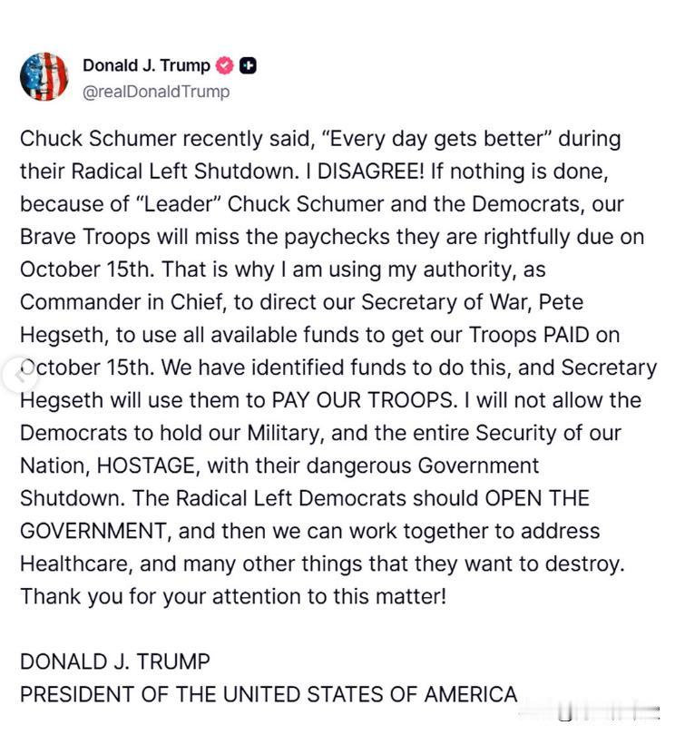政府关门:130万美军薪水怎么办? 已经两个多礼拜了美政府停摆 ,各级政府官员都回家无薪呆着,可是130万现役军人不能回家待着,必须保家卫国的。每月15日是美军发薪日,就在将士们万分焦虑薪水无着落要饿肚子持枪上岗之际,英明神武的总统先生直接根本不问财长贝森特,而是直接自家社交平台喊话:“命令国防部长赫格塞思动用所有可用资金,必须在15日给美军发薪”。 同学们,这样看来,美国防长手里还是很有钱的。外界猜测,他可以挪用军费,可以让中国台湾省预支付购买美国武器装备的款项,可以命令美国海军陆战队直接胁迫美联储开支票,可以威胁苹果老板等有钱人捐款。总之,特朗普总统的命令必须无条件执行,美军必须按时拿到薪资。 划重点:为什么美国政府经得起关门这么久? (观点不同不出恶声)