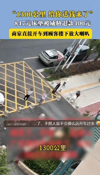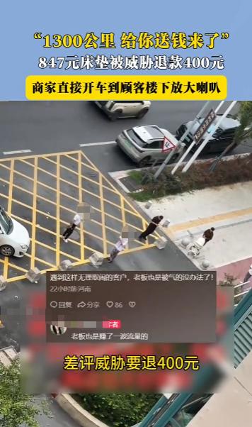 “这下后悔了吧!”10月14日,安徽芜湖,一男子购买847元床垫威胁商家退款400元,商家气不过,直接从广东佛山开车1300公里来到男子家楼下放大喇叭,称自己来送钱了!网友:这真是咎由自取! 总有人网购想占便宜,明明商品没有任何问题,还变着法儿的找理由退款,有些甚至更过分,想仅退款白嫖商品,这么做可要考虑好后果,有些商家可不是软柿子。 一男子网购了一张847元的床垫,到货后,他感觉床垫的价格有点贵,可床垫完好无损,男子没能找到售后的理由,索性直接用差评威胁商家给他退400元。 商家遇到这样无理取闹的顾客也是气得够呛,思来想去,商家一咬牙,驱车1300公里从广东佛山直接开到了安徽芜湖,来到男子家楼下。 只见商家在男子家楼下用大喇叭循环播放男子的“光荣”事迹,将其恶意威胁退款的事情一股脑全说了出来,表示自己专程开车来给他送钱。 听到这么狗血的事情,不少住户都探出头看热闹,其中一户不知是不是男子家,喊“再放报警了”,这么丢人估计男子也不敢下楼了。 不少网友觉得商家肯定是气得够呛才出此下策,毕竟1300公里的油费和高速费已经远远超过400元,男子这就是咎由自取! 信息来源:《847元床垫被威胁退款400元 商家直接开车到顾客楼下》大象新闻