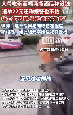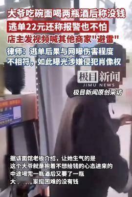 吉林白城,一大爷到面馆吃饭,点了一碗面和2瓶白酒共计22元,吃完没付钱就要走,被老板叫住结账,大爷称我家庭困难没有钱,老板气的拿出手机给大爷拍了下来,说要曝光他,你没钱说一声我给你煮碗面没问题,你还要了两瓶酒,合着你就是抱着吃霸王餐来的,岁数大也不能这么不讲理,大爷见状:你拍我也没用,你报警我也不怕,就是没钱。最后因为钱不多,担心大爷在耍无赖,老板只能认栽,最后将拍的视频发到网上,想提醒其他商家避雷。律师:如此曝光大爷涉嫌侵犯其肖像权! 事情发生在10月10日的中午,白城街头那家不到十平米的面馆里,几张木质餐桌擦得锃亮,刚出锅的面条香气裹着热气在屋里打转。 店主方丽正收拾着碗筷,想着中午的客流能多一些,好凑够当天的租金。 这时,一位穿戴整洁的大爷走了进来,深蓝色外套平整无褶,开口就问有没有酒。 方丽连忙应着,说有大瓶小瓶两种,大爷选了小瓶的,坐下后又点了一碗面。 方丽手脚麻利地将瓷碗、竹筷摆到大爷桌前,碗沿还沾着刚消毒后的温热,连筷子都特意摆成了齐整的角度。 老人眯着眼抿了一口的模样,让她心里悄悄感慨,到了这个岁数,能这般自在地品酒吃面,倒也算是种福气。 面才吃了小半碗,大爷就抬了抬胳膊冲她摆了摆,声音不大却很清晰,再来一瓶小酒。 方丽没往别处想,只当是老人嗜这口酒,笑着从柜台下层的货架上抽了一瓶,快步递过去。 等大爷放下筷子,用袖口随意擦了擦嘴角,起身就往店门口挪步,那姿态自然得像早就结过账似的。 方丽赶紧攥着记着账的小本子迎上去,脸上还带着惯有的笑,大爷,您这一碗面加两瓶小酒,一共22块,您看是扫码还是付现金? 可大爷停下脚步,回头慢悠悠抛来一句“我家里困难,没带钱”。 方丽脸上的笑一下就僵住了,整个人愣在原地好一会儿没回过神,刚才还好好品酒吃面,怎么突然就说没钱了? 方丽心想,要是老人一开始就说没带钱,她看着对方年纪大,就算免费煮碗热面也不碍事。 可现在这情况,分明是揣着逃单的主意来的,先把面和酒都吃了喝了,临到结账才说没钱,这不是明摆着欺负人吗? 她心里的火气“噌”地就上来了,声音也比刚才高了点,您要是早说没带钱,我能让您饿着?可您这吃完了才说,这不合适吧? 而更让她气闷的是,大爷见她脸色沉下来,不仅没半点歉意,反倒梗着脖子往前凑了凑。 声音还特意拔高了些,像是故意说给店里其他客人听,我就是没钱,你就算现在找警察来,我还是没钱! 那副有恃无恐的样子,把方丽的火气又往上顶了顶。 眼瞅着快到中午饭点,店里靠窗的两桌已经坐了客人,都停下筷子好奇地往这边看,还有人拿出手机悄悄拍。 方丽心里瞬间凉了半截,真要是闹起来,老人再往地上一坐说不舒服,今天这生意就彻底黄了,说不定还得惹上麻烦。 她咬了咬嘴唇,压下心里的气,摆了摆手让老人走了。 看着大爷慢悠悠走出店门的背影,方丽心里的委屈和火气怎么也压不住。 她快步追到店门口,掏出手机快速拍下大爷的背影和侧脸。 想着不能让其他同行也遭这份罪,就点开本地商户的交流群。 配了句“白城的商家们注意避雷,这人吃22元霸王餐逃单,还说报警也没用”,便随手发了出去。 发完她盯着手机屏幕,心里又堵又无奈:明明自己是受害者,怎么反倒像做错事似的? 视频发布后,评论区一下炸了锅,有人替方丽抱不平,22元也是起早贪黑揉面挣的辛苦钱,大爷穿戴整齐不像困难,就是耍无赖。 也有人提出质疑,直接发人脸视频,会不会侵犯肖像权? 河南泽槿律师事务所主任付建的观点很快被网友转发,他明确表示,店主的行为涉嫌侵犯肖像权。 虽然目的是提醒同行,但逃单22元的后果,与老人可能面临的网暴伤害程度不匹配。 付建提到,《民法典》第1019条有明确规定,未经肖像权人同意,不得制作、使用、公开他人肖像,除非是为了维护公共利益或肖像权人合法权益。 而这个说法让不少网友难以接受,有人直言,打码了还怎么避雷?大爷自己都说拍也不怕,哪来的声誉损失? 而这次事件里,方丽不是没想过报警,只是怕老人耍赖躺平,最后生意也做不成,才选择了曝光这条路。 截至10月16日,那位逃单的大爷仍未现身付款,方丽的视频还在社交平台流传,只是她悄悄给画面里的老人面部打了码。 但大爷“报警也没用”的叫嚣,是对法律权威的挑战;而店主曝光肖像的行为,也确实踩在了法律的模糊地带。 大爷的逃单行为理应受到谴责和处理,店主的维权诉求也值得被重视。 只有这样,守法者才不用在委屈中妥协,法律的尊严也能在民生细节中真正落地。 信息来源:极目新闻2025-10-11发布:大爷吃碗面喝两瓶酒后称没钱逃单22元,店主发视频喊其他商家“避雷”,律师:如此曝光涉嫌侵犯肖像权