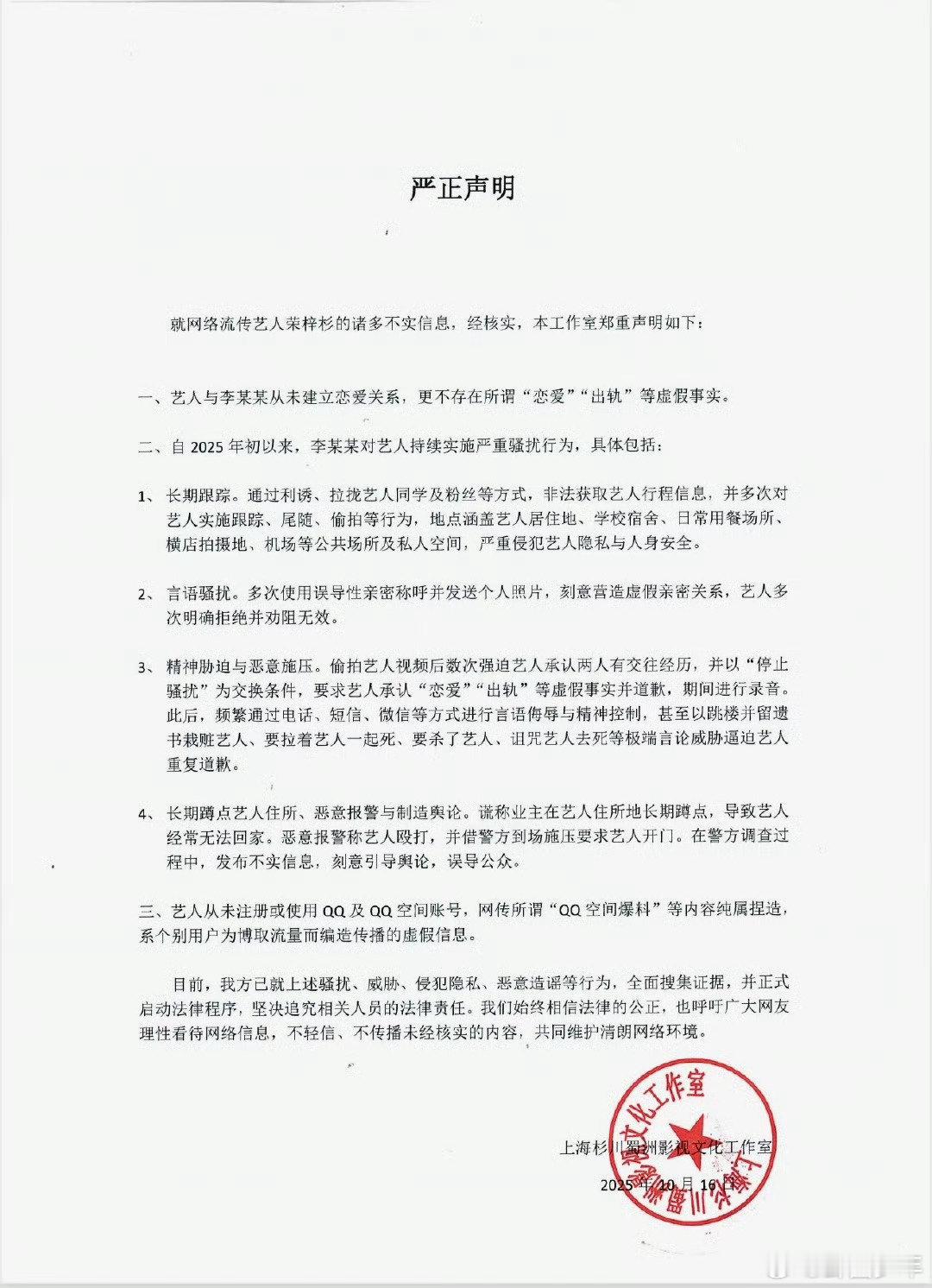 荣梓杉方称李禹熹对其持续严重骚扰荣梓杉和李禹熹未建立恋爱关系 荣梓杉方已报案,还表示李禹熹长期跟踪荣梓杉对荣梓杉严重骚扰,两人从未建立过恋爱关系