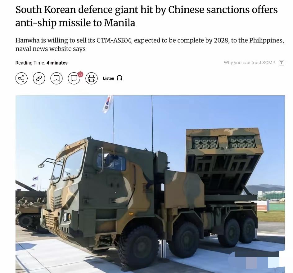 被中国制裁的韩国国防巨头韩华集团愿意向菲律宾出售其CTM-ASBM导弹 分析人士称,在北京对韩国造船业实施制裁的同时,韩国国防巨头韩华集团提出向菲律宾出售反舰导弹,这表明韩国选择倾向于与美国及其盟友开展国防工业合作。 网友评论: 欢迎韩国打破默契,向菲律宾售卖军火。为了发展中朝友谊,中国将进一步携手朝鲜,发展制造业等合作。 国防产品出口需要国家批准,这说明韩国已站在中国的对立面,对韩国不要再客气,积极支持朝鲜军工发展。 所以就要进一步制裁么,再说如果中国不制裁的话,他们就不会出售导弹了?这种军售谈判可不是24小时内就能决定的,因为还涉及到国家之间的政治关系,那么现在基本就能确定韩国是敌对国家了。 恶意针对中国我们就制裁!这是正当防卫的权利!这是正常国家的本能!我们不惹事也不怕事! 各位朋友怎么看?欢迎在评论区留言讨论