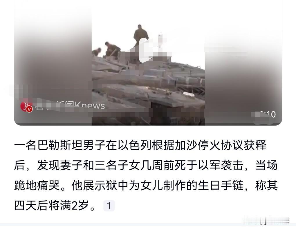 这真的是人间惨剧。 这一切的始作俑者就是丧心病狂的以色列。 10月16日在网上看到这么个消息。 巴勒斯坦男子获释后发现全家遇难。 男子的内心是多么的痛苦,失去了老婆和孩子。 在几周前被以军杀害了。 男子的脸上满身是伤,搀扶才能行走,应该是遭受过虐待。