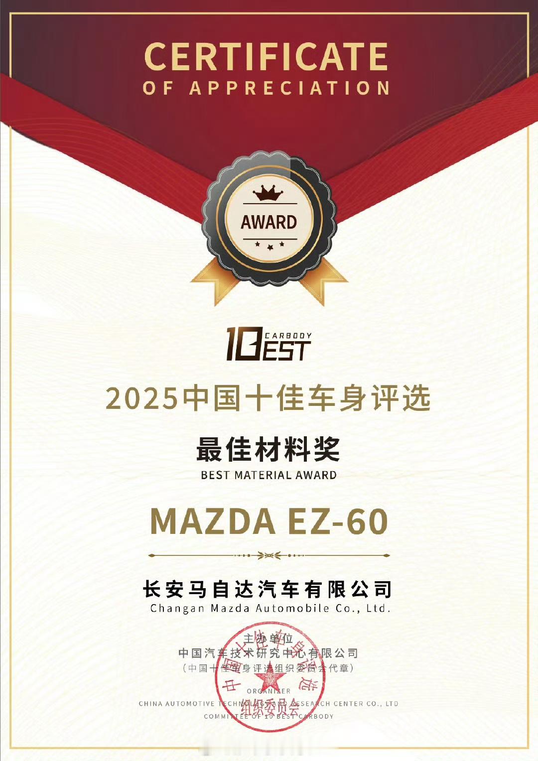 同时马自达EZ-60还拿下了「2025中国十佳车身」、「最佳材料奖」,安全性拉满。