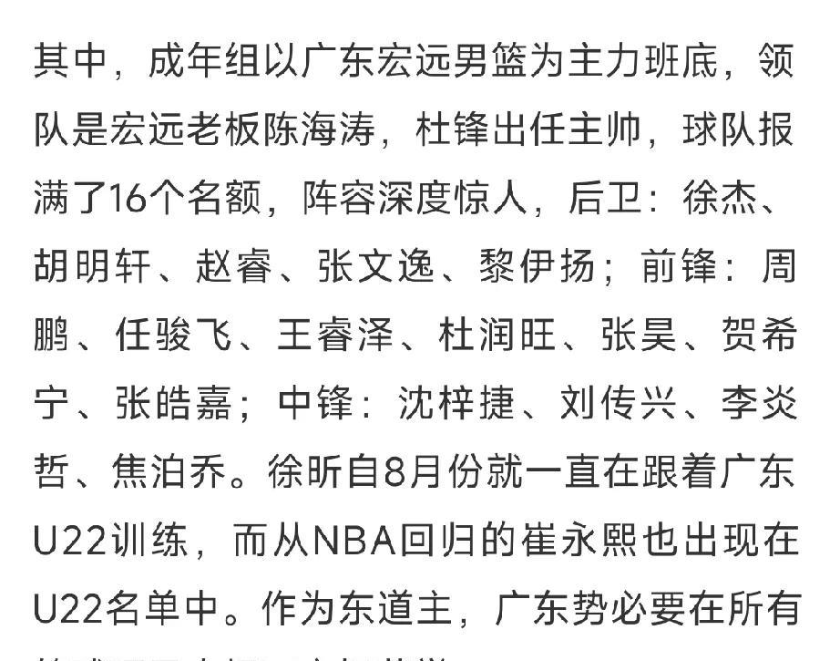 广东男篮全运会阵容极其恐怖,这是拼了! 全运会男篮的比赛即将开始,各支球队的阵容也陆续出具,看了东道主广东男篮的阵容,真的是极其豪华,全运会的广东队汇集了CBA三支球队的精锐,广东男篮、广州龙狮、深圳男篮,相当于合三为一!你说这阵容深度厚不厚! 相比之下,卫冕冠军辽宁队的阵容相对要单薄一些,像退役的大韩和周俊成都请回来了,实在是没人了! 根据现有阵容名单,预测下两队12人名单。 辽宁队 后卫:赵继伟、高诗岩、鄢手琪、李虎翼、周俊成 锋线:俞泽辰、原帅、付豪、李晓旭、吴昌泽 中锋:韩德君、刘雁宇 广东队 后卫:徐杰、胡明轩、赵睿、张文逸 锋线:杜润旺、周鹏、王睿泽、贺希宁、张皓嘉 中锋:沈梓捷、焦泊乔、李炎哲