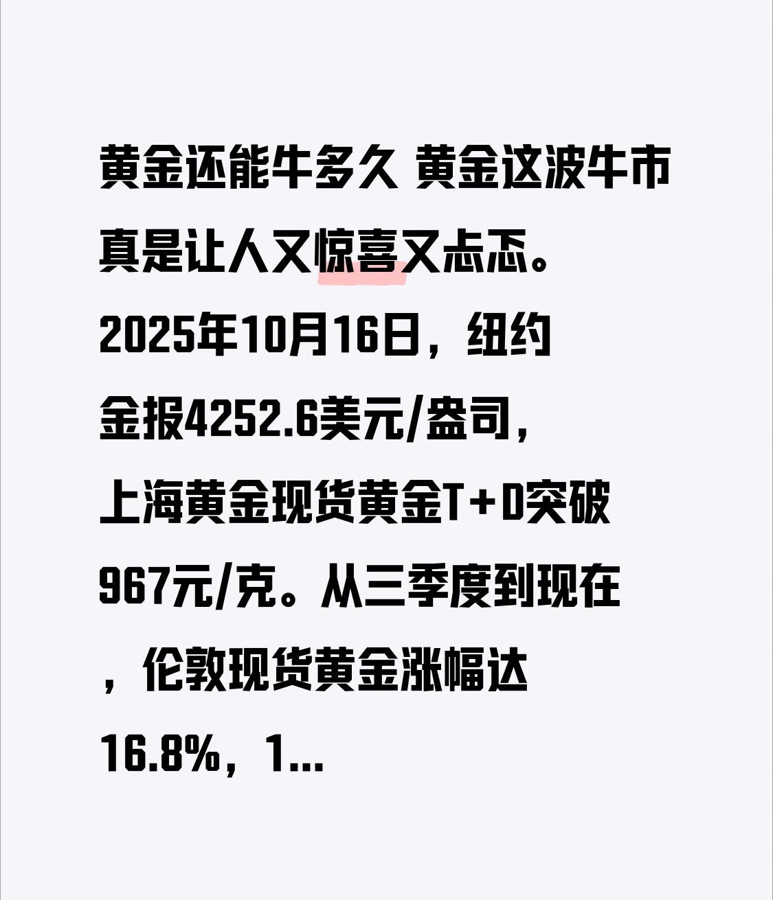 黄金还能牛多久黄金这波牛市真是让人又惊喜又忐忑。2025年10月16日,纽约金