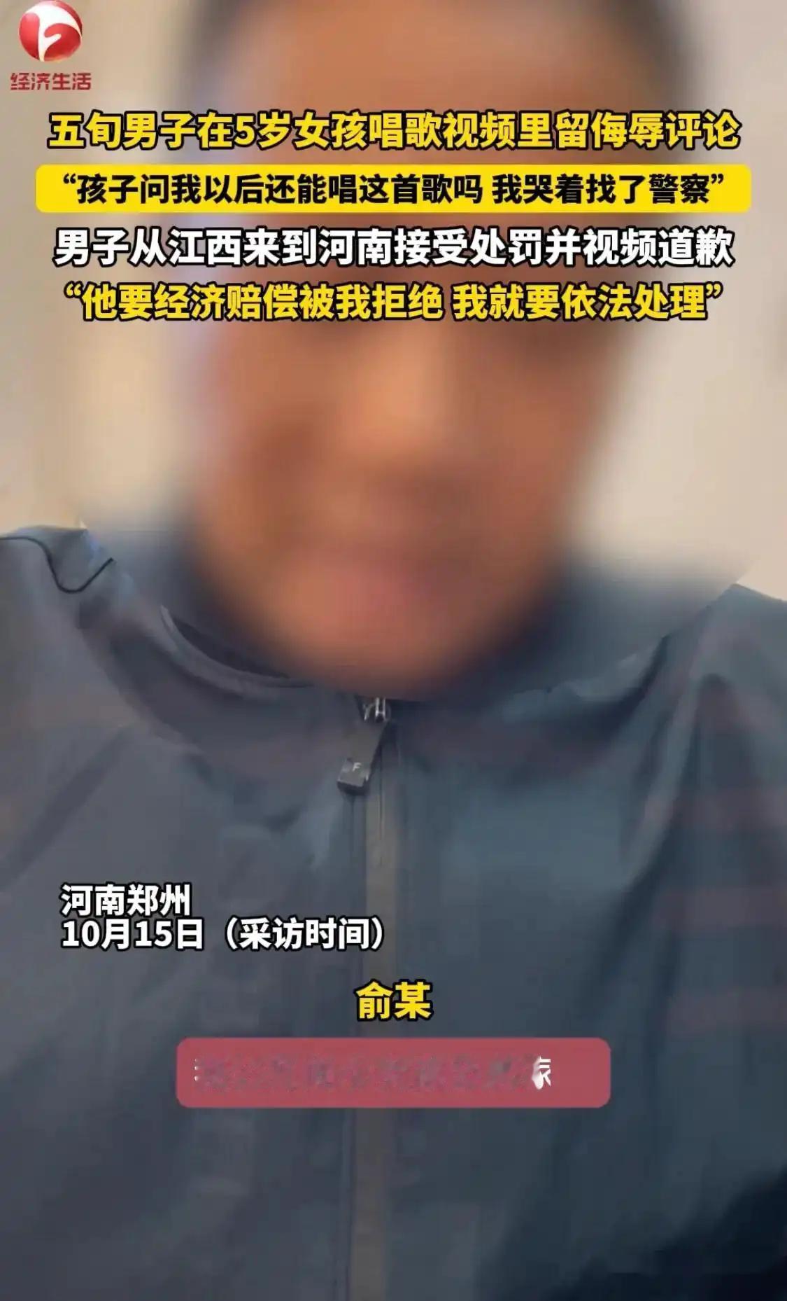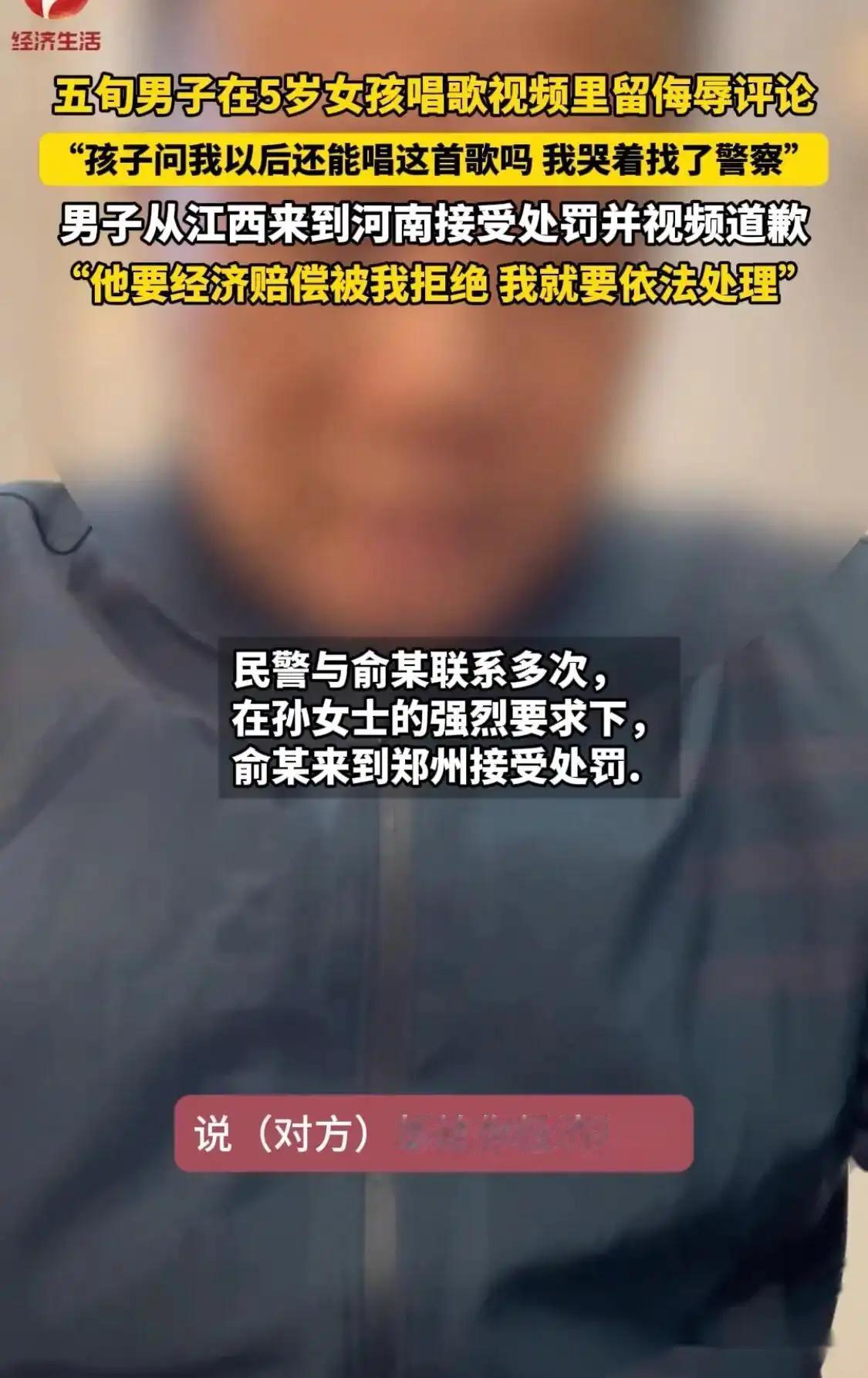 不狂了?男子在5岁女孩视频写侮辱评论,后续:从江西赴河南道歉 《网络不是法外之地,恶言必有恶报》河南郑州的孙女士,在十一期间给5岁女儿拍了一个唱《歌唱祖国》的视频,孙女士说:看着女儿开心的样子,也收获了一堆赞美,没想到第二天却遭到一名江西网友的恶意评论。 孙女士很气愤,也很无奈,于是带着女儿去报警了,想让对方给个说法。没想到警方办事效率如此之高,很快就联系上了那个江西网友。原来该网友名叫俞某某,年过50,在江西某单位上班,平时也就爱好打打麻将。 没想到这次一时嘴快,惹下大祸。俞某某被警方传唤到郑州后,对孙女士母女俩进行了当面道歉,并接受了警方的罚款500元处罚。孙女士说:虽然俞某某道歉了,但自己和女儿受到的伤害不能不算补偿,于是要求对方给自己和女儿录制了道歉视频,并且拒绝了对方提出的经济补偿。 结束了这场闹剧,两人也算各自消停了,但没想到这一事件在网络上却引起了网友的热议!都说:网络不是法外之地,恶言必有恶报,你看那个江西网友嘴多快,被罚款道歉也算是便宜他了。做人吧,哪怕心里不痛快,也要留点口德在网上,说不定哪句话就惹下大祸呢?