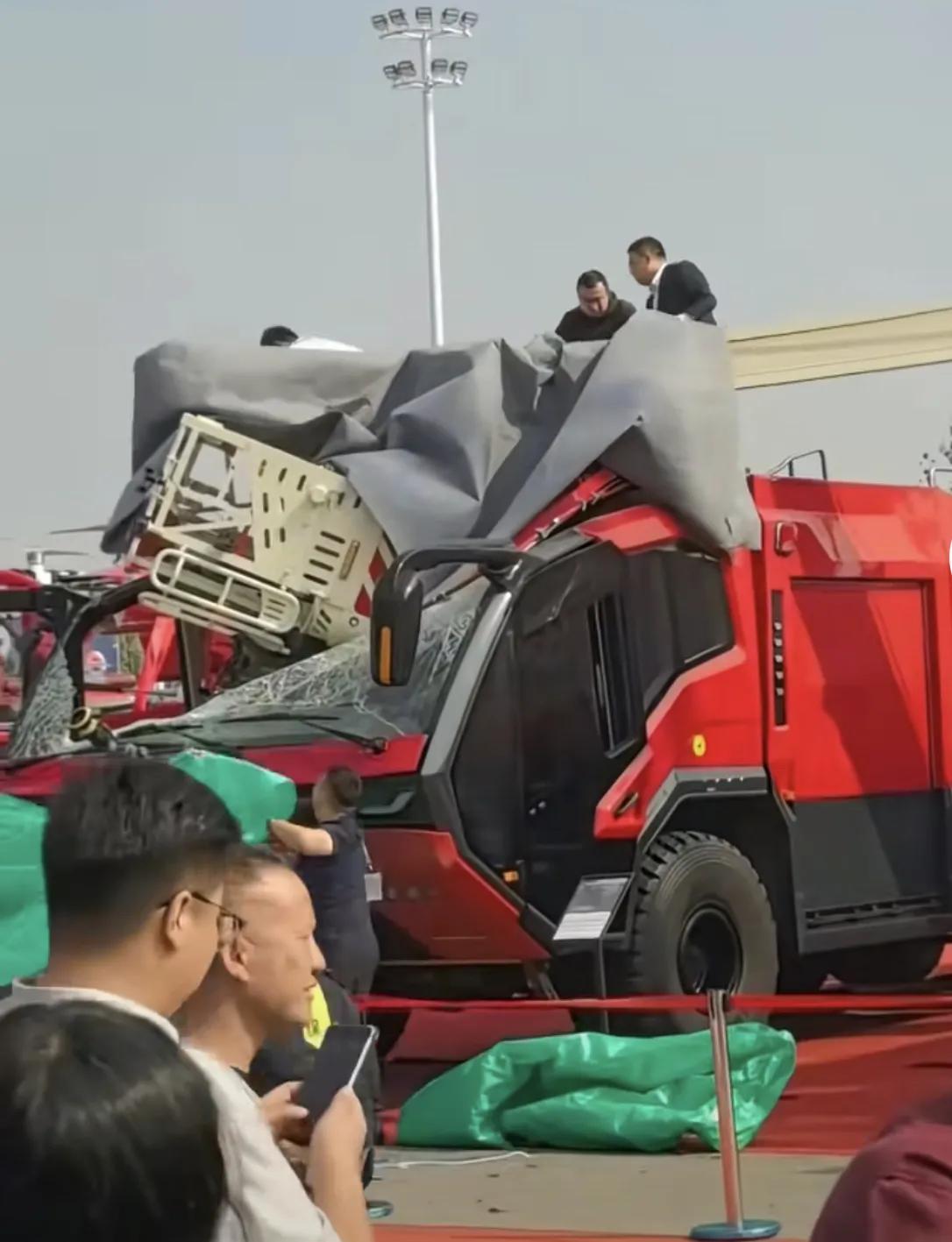 这下闹笑话了, 全国都知道了! 没想到,前天的消防展会上,一辆登高平台的消防车,云梯突然掉落,砸到了另一台消防车。 幸运的是,这辆消防车也是他们公司的,不需要赔偿,修一下即可。 现场的工作人员,第一时间爬上去给车子盖上了毯子,但是大臂上的Logo还是清晰可见。 事后该公司的工作人员回应:这款车还没有对外公开销售,处于实验阶段,只做了这一台车。 但不管怎么说,既然拿到公开场合展示,就应该符合要求,不应该找借口。 在还没有负重的情况下,大臂都能断裂,属实让同行看笑话了。。