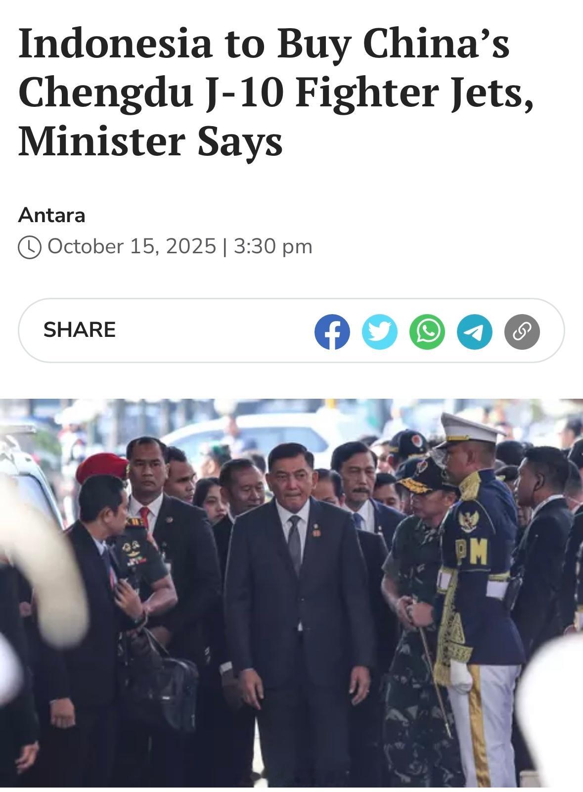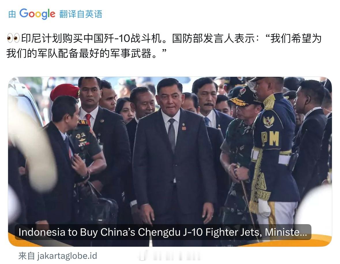印尼国防部长周三透露,印尼即将购买中国成都歼-10 战斗机,以升级其军事机队。