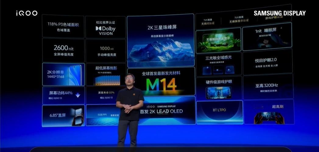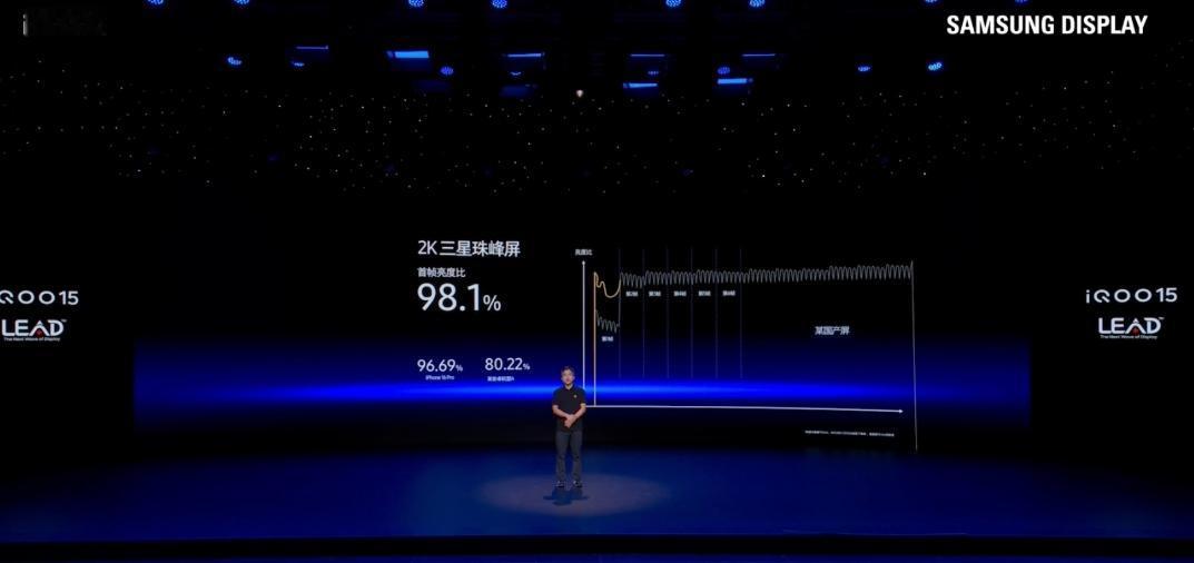 一早打卡了iQOO 三星显示技术沟通会 再次感受了iQOO 15上那块2K三星珠峰屏的实力 下面用大白话跟大家汇报下: 最重要的是全新LEAD技术,面板没有了过往偏光层,所以面板透光率更高,同2K同亮度下更省电,iQOO15屏幕功耗比上代低了44%,可以带来无偏振自然光。 这种技术下,戴太阳镜看手机也不会出现明暗变化的现象。 而再加上M14发光材料,全局最高亮度干到了2600nits,局部峰值亮度6000nits,屏幕亮度更高,显示更通透,且支持1nit超低亮度。 同时,iQOO15加入三光敏传感器,当你所在环境光线变化时,手机屏幕亮度会更快更精准且线性自然的自动调节,不需要再手动调了。 最后首帧亮度比,当我们刷评论区时,第一次滑动字都是虚的,这就是该参数的意义,iQOO15上解决了,而且达到了苹果的水准。 总结就是,从制造工艺到实际体验都很顶!