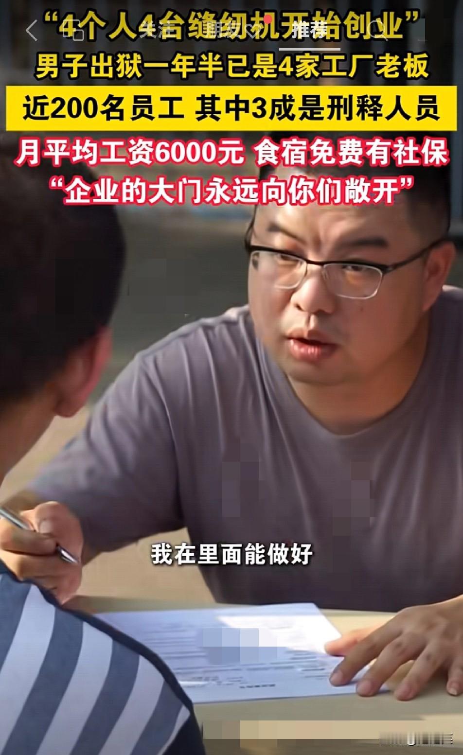 刷到这事儿我眼眶都热了 一男子自己坐过牢 出狱后靠4台缝纫机创业 一年半就开了4家工厂,招了近200名员工,其中3成都是和他一样的刑释人员 工厂不仅月均工资6000元还包吃住交社保 当他自己从泥潭里爬出来,还伸手拉别人一把,这到底是共情还是冒险 这事儿是让咱看到人性的暖,还是该警惕潜在隐患