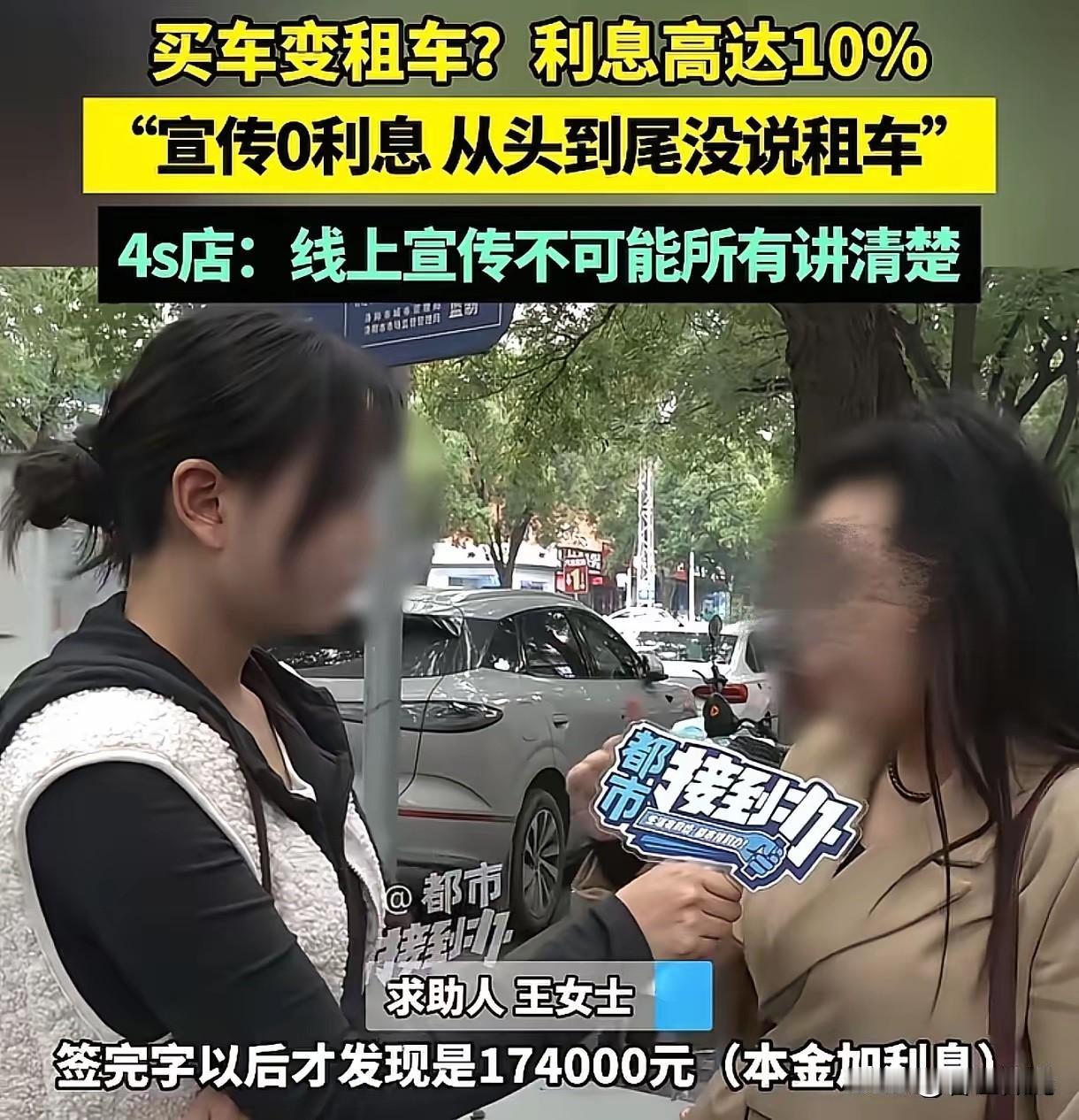 河南洛阳,女子带孩子去买车,跟4s店谈好,车辆总价138000元,不用首付,零利息。可女子孩子签完字后,这才发现他们以为的贷款买车变成了融资租赁,5年以内他们对车辆只有使用权,没有所有权,车子不是他们的,并且连本带息要还174000元,利息10%。女子觉得对方宣传的0息,纯粹是在诱导他们。销售经理却说:客户只有几千块钱,就想把车提走,他只要求0首付,月供4000以内,我是按照这个诉求来的。 王女士一家去给孩子买车,他们看中了一辆138000元的车辆,但是孩子刚大学毕业2年,手头没有多少积蓄,他们在4S店看到可以0息,便想着以贷款的方式来买车。王女士的儿子小周,毕业后在洛阳一家互联网公司做运营,每月工资六千出头,除去一千八的房租和日常开销,工作两年只攒下八千多块。每次加班到深夜,看着路边打车排队的长队,他就特别想买辆车,哪怕只是代步,至少不用在寒风里等车。王女士知道孩子的心思,跟老伴商量:“咱娃在外头不容易,就算帮衬点,也得让他把车买了。” 周末一早,一家三口揣着那点积蓄去了4S店。刚进门,一个穿黑西装的销售就迎上来,听说是给刚工作的年轻人买车,还在意首付和利息,立马拉着他们到目标车型前:“叔婶,你们眼光真好!这款车年轻人最爱,现在还有0首付、0利息活动,专门针对刚入职场的小伙儿。”他指着展厅墙上的海报,红底黄字的“0首付”“0利息”格外扎眼,下面的小字挤在一起,王女士老花眼眯成一条缝也看不清,小周光顾着打量车的内饰,压根没注意那些不起眼的文字。 “真不用先掏钱?后面也不用还利息?”王女士反复确认,销售拍着胸脯:“咱是正规4S店,还能骗你们?月供就四千以内,你家娃一个月六千多,肯定负担得起。”小周心里一盘算,月供四千,自己省着点花,剩下的钱够吃饭,不用家里再出钱,还能马上提车,简直再合适不过。 接下来的流程快得像“赶场”。销售抱来一摞文件,说都是“走个形式”的手续,让小周跟着他指的地方签字。小周没什么社会经验,觉得4S店这么大,肯定靠谱,拿起笔“唰唰”签了七八个名字。王女士和老伴在旁边,一会儿被催着填手机号,一会儿被让去复印身份证,俩人插不上手,只盼着赶紧签完,好看着孩子把车开回家。 签完字,销售把一份合同塞给他们,说明天就能提车,一家三口乐呵呵回了家。晚上王女士想着再看看合同踏实,戴上老花镜一翻,瞬间慌了神——合同封皮写的是“融资租赁合同”,里面一条清清楚楚:“租赁期5年,车辆所有权归出租方,承租方仅拥有使用权”。她赶紧喊来小周,小周一看也懵了:“我要的是贷款买车,怎么成租了?” 再往下翻,总租金174000元,比车价多了36000元!王女士拿计算器一算,这利息摊到5年,年利率快10%,跟销售说的“0利息”完全是两码事。她连夜给销售打电话,对方却支支吾吾:“合同上都写了,是你们自己没看仔细。” 第二天一早,王女士带着小周和合同冲到4S店。销售不在,经理出面了,听完情况,经理反倒一脸不耐烦:“阿姨,您家孩子就几千块钱,想提车,当时说的就是0首付、月供四千以内,我们按这个诉求办的啊。”“可你们说的是0利息,是贷款!现在车不是我们的,还得还这么多利息,这不是诱导吗?”王女士急得声音发颤。经理却指着合同小字:“这儿写了融资租赁的规则,利息含在租金里。当时你们要是问,我们会解释,可你们没问啊。” 王女士瞬间哑口无言,她知道是自己和孩子太大意,可销售从头到尾只吹“0首付”“0利息”,压根没提过“融资租赁”,更没说过5年车不归自己。小周站在旁边,脸憋得通红,又气又悔,觉得自己被几句甜言蜜语骗了,现在每月四千月供要还五年,车还不是自己的,压力压得他喘不过气。 这种事在4S店并不少见。不少店家抓着年轻人“想提前享受、手头紧”的心理,用“0首付”“0利息”当噱头,背地里把“贷款”换成“融资租赁”。贷款买车,还完钱车就是自己的;可融资租赁本质是租车,没按时还款车会被收走,总花费比贷款高得多。销售们只说“低月供”,关键信息要么藏在小字里,要么压根不提,等着没经验的消费者跳坑。 王女士现在进退两难,退合同要付违约金,继续履行又不甘心。她只希望自己的经历能提醒大家,以后签字前一定要把条款看明白,尤其是小字,不懂就问,别被花言巧语忽悠,不然最后吃亏的还是自己。 各位读者你们怎么看?欢迎在评论区讨论。