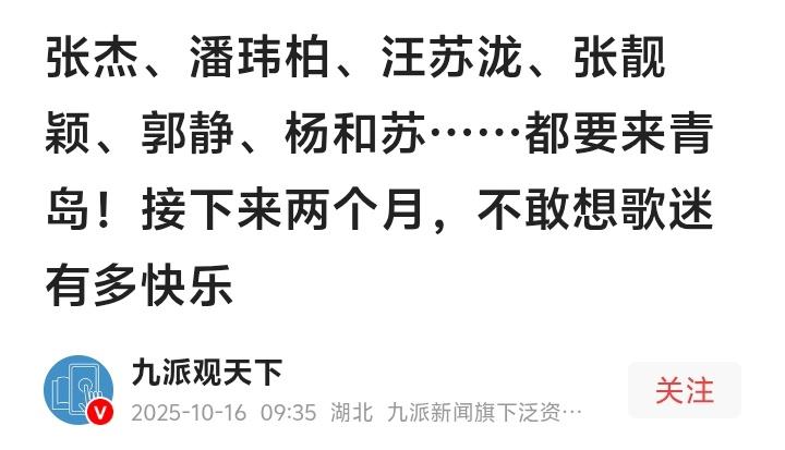 青岛变身音乐狂欢乐园!张杰潘玮柏汪苏泷张靓颖郭静杨和苏等巨星接连开唱,海边城市夜晚彻底沸腾! (来源:青岛日报、观海新闻客户端、青岛市文化和旅游局) 初秋的青岛,海风裹挟着咸涩的气息,却即将被另一种炽热的能量席卷。当音乐与海浪相遇,这座城市的夜空将不再只有星光闪烁。从十月到十一月,张杰、潘玮柏、汪苏泷、张靓颖、郭静、杨和苏等实力唱将轮番登台,仿佛一场精心编排的盛宴,只为唤醒每个沉睡的耳朵。 杨和苏的“理想国”风暴率先登陆,这位从《中国新说唱》冠军蜕变为明星制作人的音乐人,将以极具爆发力的舞台掌控力点燃青岛体育中心。他的歌词像一把锋利的刀,剖开现实与理想的距离,而现场观众将在这场“苏”式狂潮中,找到属于年轻人的呐喊与共鸣。 紧随其后的是张杰的“未·LIVE—开往1982”巡演。滑动地屏、裸眼3D技术与超炫音响的融合,早已让前几站观众惊叹不已。当《逆战》《天下》等金曲响彻青岛市民健身中心,数万人挥舞的荧光棒将汇成星河,而张杰的高音不仅是技术的展示,更是情感的爆破——那是青春的回响,也是成长的见证。 同一夜晚,汪苏泷、张靓颖等人携《天赐的声音》演唱会空降国信体育场。张靓颖的海豚音穿透云霄,汪苏泷的创作才情如水般流淌,黄子弘凡与王赫野的碰撞则充满新鲜感。这不仅是耳膜的盛宴,更是一场关于音乐本质的探讨:何为天作之合?或许答案就在每个观众被旋律触动的心跳声中。 潘玮柏的“狂爱2.0”则像一场迟来的狂欢。从《快乐崇拜》到《不得不爱》,他的音乐承载着千禧年代的集体记忆。去年青岛的余温未散,今年他再度归来,用节奏与律动证明:有些热爱从未褪色,反而在时光中愈发滚烫。 郭静的专场则像一杯温热的茶,治愈而绵长。《下一个天亮》《心墙》这些歌曲曾陪伴无数人度过深夜的迷茫。在凤凰之声大剧院的聚光灯下,她的声音将化作温柔的双手,轻抚每个为爱悸动或遗憾的灵魂。 这场持续两个月的音乐盛宴,背后是城市文化与大众情感的深度联结。青岛不再只是啤酒与海鲜的代名词,它正用音乐为自己贴上新的标签——一座能让梦想与回忆同时落地的城市。当歌手与观众在旋律中交换情绪,当个体孤独被集体合唱消解,我们突然明白:音乐的本质,是让陌生人成为同类。 你准备好加入这场海边狂欢了吗?无论是为青春赴约,还是为压力寻一个出口,这些舞台总有一处能安放你的情绪。别忘了,音乐永远是最直接的共情语言。 青岛 音乐狂欢乐园 青岛演唱会 音乐狂欢巨星