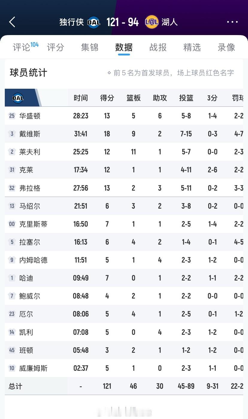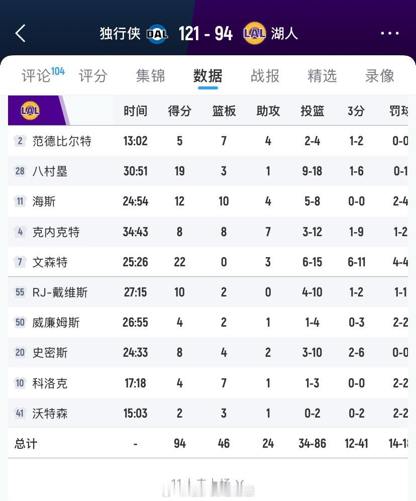 失去罚球优待!湖人主场94-121惨败独行侠[衰]