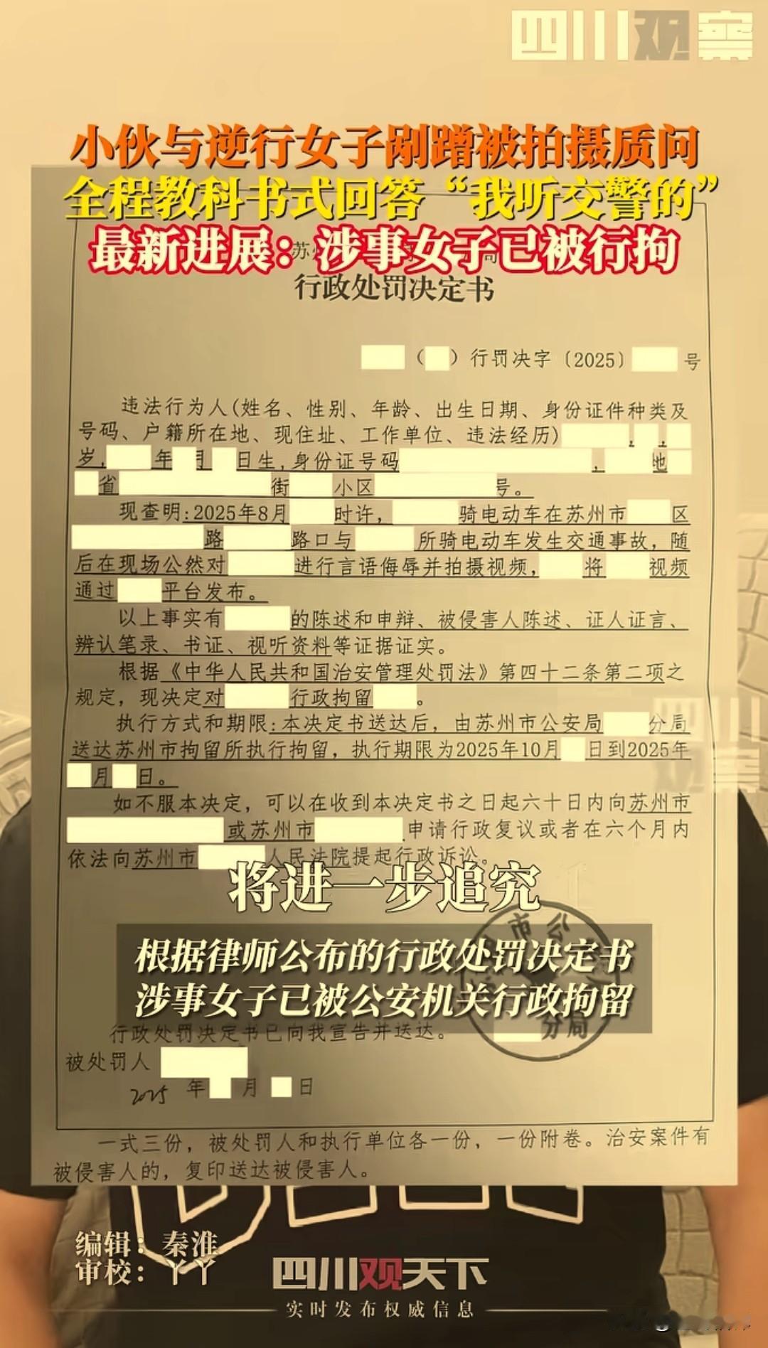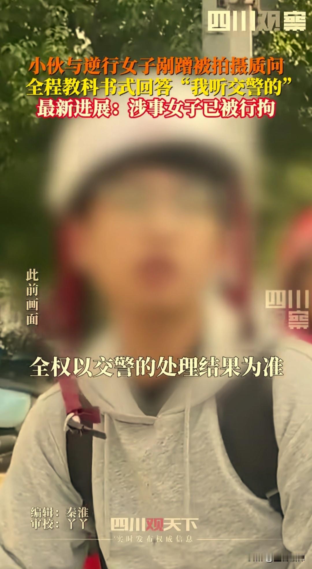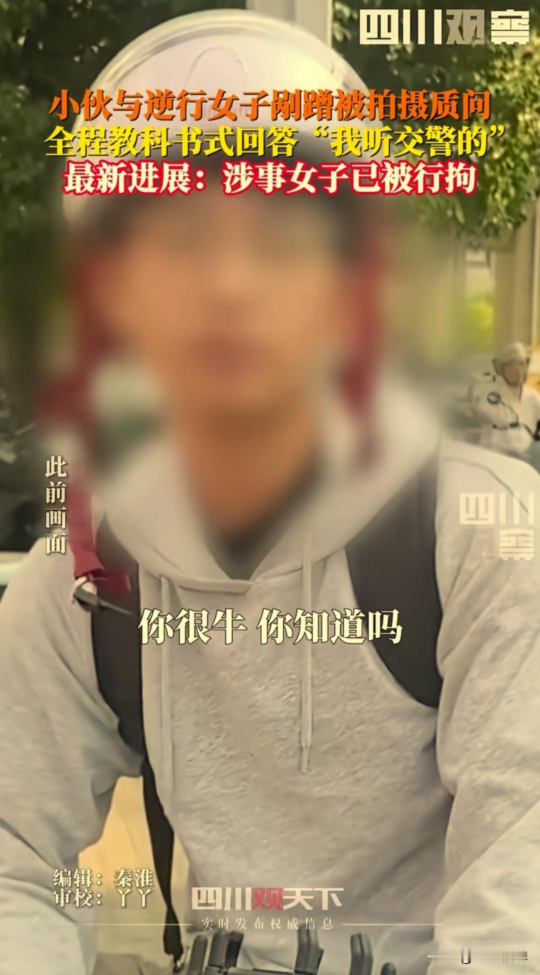 小伙骑车和逆行女子发生剐蹭,女子拿手机对着小伙拍摄质问,小伙不急不躁,全程冷静的教科书式回答:“我听交警的”,事件最近进展,涉事女子已被行拘。 事件发生在8月4日,苏州一小伙骑车时与一名逆行的女子发生剐蹭,女子对着小伙边拍摄边质问。 女子一直说:“撞了人你还揍人是吧?”、“你怎么活到现在的,我就想不明白了。”、“撞了我没关系是吧?”,“理所当然是吧?你可真牛X”。 女子试图诱导男子承认责任,小伙则全程很沉着冷静,也没有争吵,女子反问他就回答:“等交警来,我听交警的”。 女子事后擅自将视频发布到网上,并泄露了小伙个人信息,对其生活造成困扰。 女子此举也导致自己被公安机关行政拘留,小伙仍考虑通过民事诉讼进一步维权。 来源:四川观察