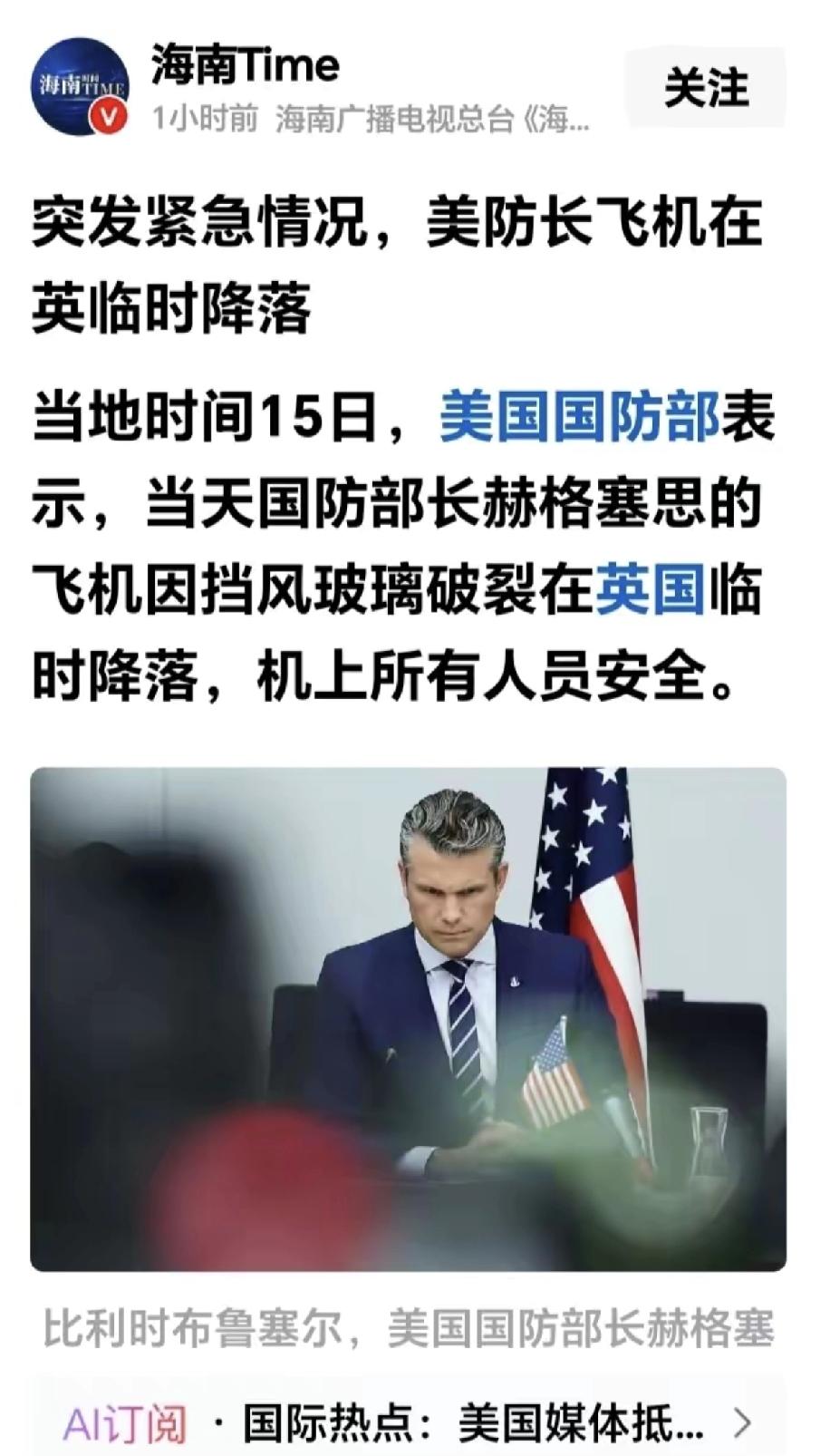 是什么人,为美国国防部长,安排了一架有事故隐患的专机呢?据最新消息,当地时间15日,美国国防部长赫格塞思乘坐的专机突发挡风玻璃碎裂,不得不临时迫降英国! 这事儿透着邪乎。要知道,C-32A作为波音757的军用版,向来以皮实著称。去年国务卿鲁比奥的专机刚出过挡风玻璃故障,今年就轮到国防部长,这巧合未免太蹊跷。 赫格塞思本人也不是省油的灯。这位哈佛普林斯顿双料学霸,当过国民警卫队上尉,在福克斯新闻干过主持,去年刚被特朗普提名为国防部长。上任第一件事就是大搞“信号门”,把打击胡塞武装的机密计划发到自家亲友群里,气得五角大楼老将们直拍桌子。 这次欧洲之行更不简单。他在北约防长会上力挺乌克兰放弃领土换和平,转身又和卡塔尔签协议,要在爱达荷州给人家建F-15战机训练基地。这操作把特朗普的极右翼盟友们都得罪惨了,网红劳拉·卢默直接在社交媒体开骂,说他“把美国领土卖给恐怖金主”。 飞机出事时,赫格塞思正从布鲁塞尔往回赶。据FlightRadar24的数据,飞机在爱尔兰西南海岸突然下降2万英尺,应答器狂闪7700紧急代码。机上乘客后来透露,当时驾驶舱传来刺耳的警报声,挡风玻璃从中间裂开蛛网状纹路,机长不得不手动控制飞机紧急转向。 最诡异的是迫降地点——英国米尔登霍尔皇家空军基地。这地方表面上是美军在欧洲的运输枢纽,实际上藏着不少秘密。冷战时期这里是核轰炸机的前沿阵地,现在依然是美军全球快速反应部队的重要节点。赫格塞思的专机偏偏选这里迫降,难道只是巧合? 五角大楼的声明更是漏洞百出。发言人肖恩·帕内尔一口咬定是“挡风玻璃自然老化”,却拿不出具体维护记录。要知道,C-32A的挡风玻璃每2000小时就得强制更换,这架飞机上个月刚完成1200小时的跨大西洋飞行,怎么突然就老化了? 更关键的是,赫格塞思的行程安排只有极少数人知道。专机起飞前3小时才临时变更航线,避开了法国空域。能在这么短时间内动手脚的,恐怕只有内部人。联想到他最近在五角大楼大搞“瘦身计划”,裁掉800多名文职人员,说不定有人想给他点颜色看看。 最可怜的是机组人员。副驾驶是个有20年经验的老机长,事发后接受采访时声音都在发抖:“我这辈子飞过12000小时,从没见过这种情况。挡风玻璃就像被什么东西从内部炸开一样。”地勤人员检查后发现,玻璃夹层里有微量金属碎屑,这更坐实了人为破坏的猜测。 赫格塞思本人倒是淡定。落地后他发了条推文:“一切安好,继续执行任务。”但明眼人都看得出来,这次事故已经动摇了他的政治根基。特朗普虽然没公开表态,但据说在白宫会议上摔了咖啡杯,大骂“赫格塞思连架飞机都管不好”。 这事儿还牵扯出更大的阴谋。最近美国军方高层频繁出事:太平洋舰队司令上个月在办公室突发心脏病,欧洲司令部情报主管上周遇车祸重伤。有五角大楼匿名官员透露,这是一场针对特朗普亲信的“清洗行动”,幕后黑手可能来自军工复合体。 最讽刺的是,赫格塞思刚在北约吹完“美国军事技术领先全球”,转头就被自家飞机打脸。更让人寒心的是,事故发生后,五角大楼第一时间想到的不是调查真相,而是封锁消息。所有机组人员都被要求签署保密协议,现场录像也被列为“最高机密”。 这场空中惊魂暴露的,是美国军工体系的系统性腐败。波音公司为了赶工,把挡风玻璃的检测周期从3天压缩到8小时;军方采购官员收受贿赂,对不合格零件睁一只眼闭一只眼;情报部门忙着内斗,根本没人关心高层安全。 赫格塞思侥幸捡回一条命,但美国的全球领导力正在这场事故中慢慢崩塌。当国防部长的专机都成了移动炸弹,还有哪个盟友敢真心投靠?更可怕的是,这种腐败就像飞机上的裂痕,从内部一点点侵蚀着这个超级大国的根基。 各位读者你们怎么看?欢迎在评论区讨论。白宫情报总监 驾驶舱的秘密