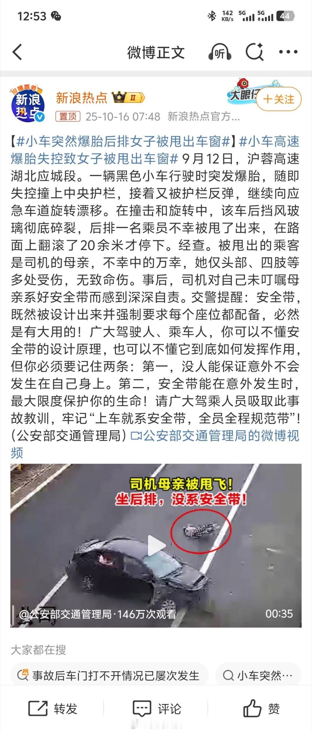 小车突然爆胎后排女子被甩出车窗不论坐在前排还是后排,千万扣上安全带!