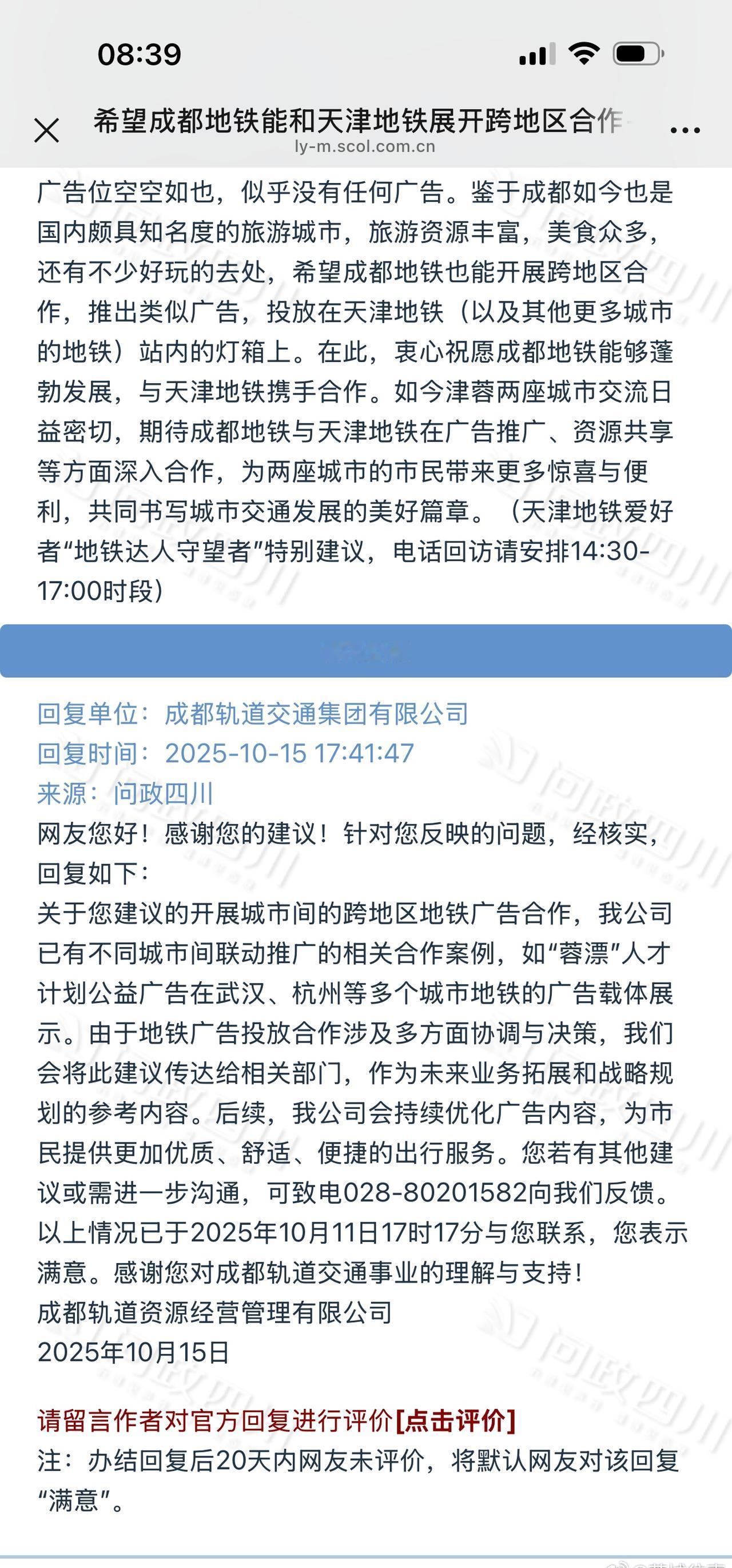 成都地铁回复真的太认真了,我觉得,应该加一条:目前成都地铁灯箱广告位也是空空如也,鉴于天津是京津冀重要城市,有着强大的周边资源能力,天津也是一座有文化的城市,欢迎天津地铁也来成都地铁投个广告。@天津地铁运营 @天津轨道交通