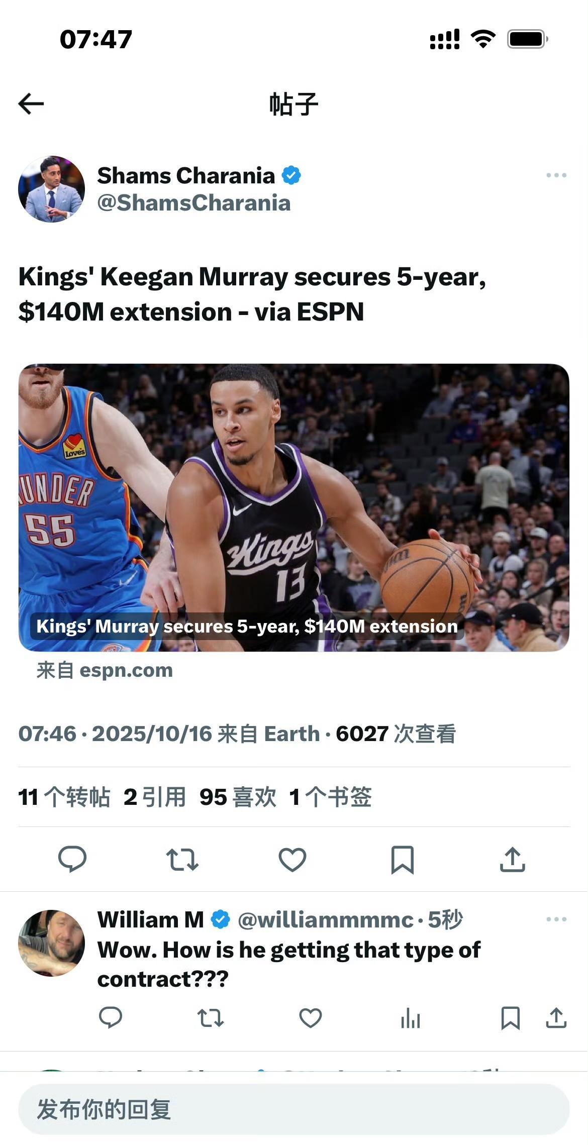 基根穆雷5年1.4亿提前续约国王! 据shams报道:2025年10月16日基根穆雷与国王达成了一份5年1.4亿提前续约合同,没有任何球员或者球队选项。 据ESPN报道:穆雷过去三个赛季投进了500个三分球、完成了150个盖帽和150次抢断,一共有3人达成这项记录,另外两个人是华子和小白。 随着穆雷的续约他也成为今年第六位在10月20日截止日期前获得提前续约合同的球员。 穆雷曾单场扔进了12颗三分球,2023年12月17日,三分球15中12,打破了国王队史单场三分球命中记录。拥有出色的空间和掩护能力,篮下终结效率高,防守轮转意识强。#NBA睿闻# #NBA热点# #NBA吐槽大会#