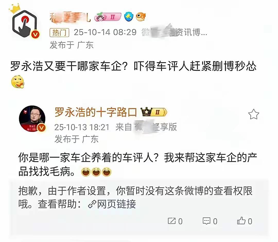 真是被这位车评人给逗笑了,你说你没事招惹罗永浩干嘛呢? 感觉这位车评人,可真是吃饱了撑得,闲的没事干了,点了份西贝的外卖,吐槽西贝既不便宜也不好吃,也就算了,可偏偏最后还加上了一句:“只为我讨厌罗永浩而表态一下。” 结果罗永浩也不惯着他,直接来了一句:“你是哪一家车企养的车评人?我来帮这家车企的产品找找毛病。”,本以为这位车评人,看到罗永浩说的这句话后,会凭借着自己车评人的专业知识,跟罗永浩争论一番,可没想到的是,这位车评人看到罗永浩这句话后,直接火速删文认怂了,真是让人大失所望啊! 真是被这位车评人的操作给逗笑了,既然惹不起罗永浩,就别去招惹罗永浩啊,把自己搞的跟个跳梁小丑一样,让大家看了个笑话! #秋日生活打卡季#