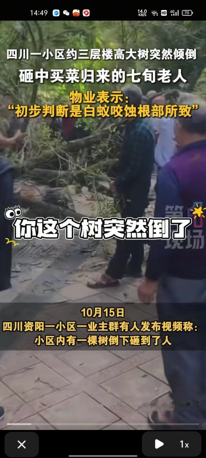 10月15日,四川资阳。网友发视频称,小区内有一棵树倒下砸到了人,系约三层楼高的皂角树,被砸老人70岁左右。老人被送医治疗,初步检查无生命危险。 物业回应称,初步判断是白蚁咬蚀根部导致,该树外观长势良好,倾倒毫无征兆。