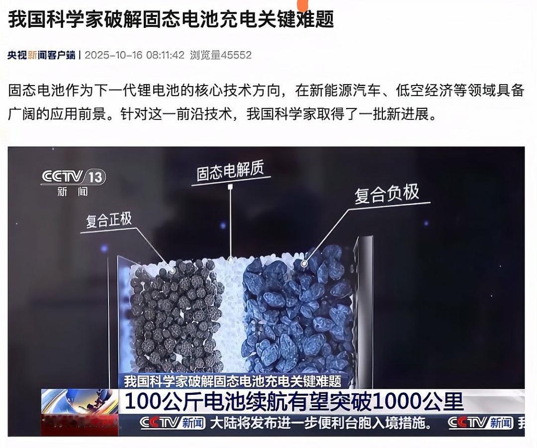 中国科学家放大招!固态电池难题被攻克,新能源车主再也不用“里程焦虑”了 家人们!以后开新能源车跑高速,再也不用像“热锅上的蚂蚁”似的找充电桩了!我国科学家直接把固态电池的“老大难”问题给拿捏了,这操作简直比手机快充还让人惊喜! 中科院物理所搞出“神奇胶水”碘离子,电池里有缝隙?它自动补上,比装修师傅填缝还靠谱;金属所给电解质装了“柔韧骨架”,电池摔两下都不怕变形,储电还更猛;清华更狠,用特殊材料给电池加了“高压防护盾”,安全又能跑远路。 以前开新能源车,续航300公里就慌得不行,以后1000公里都是“小菜一碟”!这哪是电池升级啊,简直是给新能源汽车装了“超跑心脏”!以后出门自驾游,想走就走,再也不用规划充电桩路线,新能源车主终于能扬眉吐气啦!国产全固态电池 全固态电池 固态锂电池 储能型固态电池 半固态电池 固态储能电池 长寿命固态电池