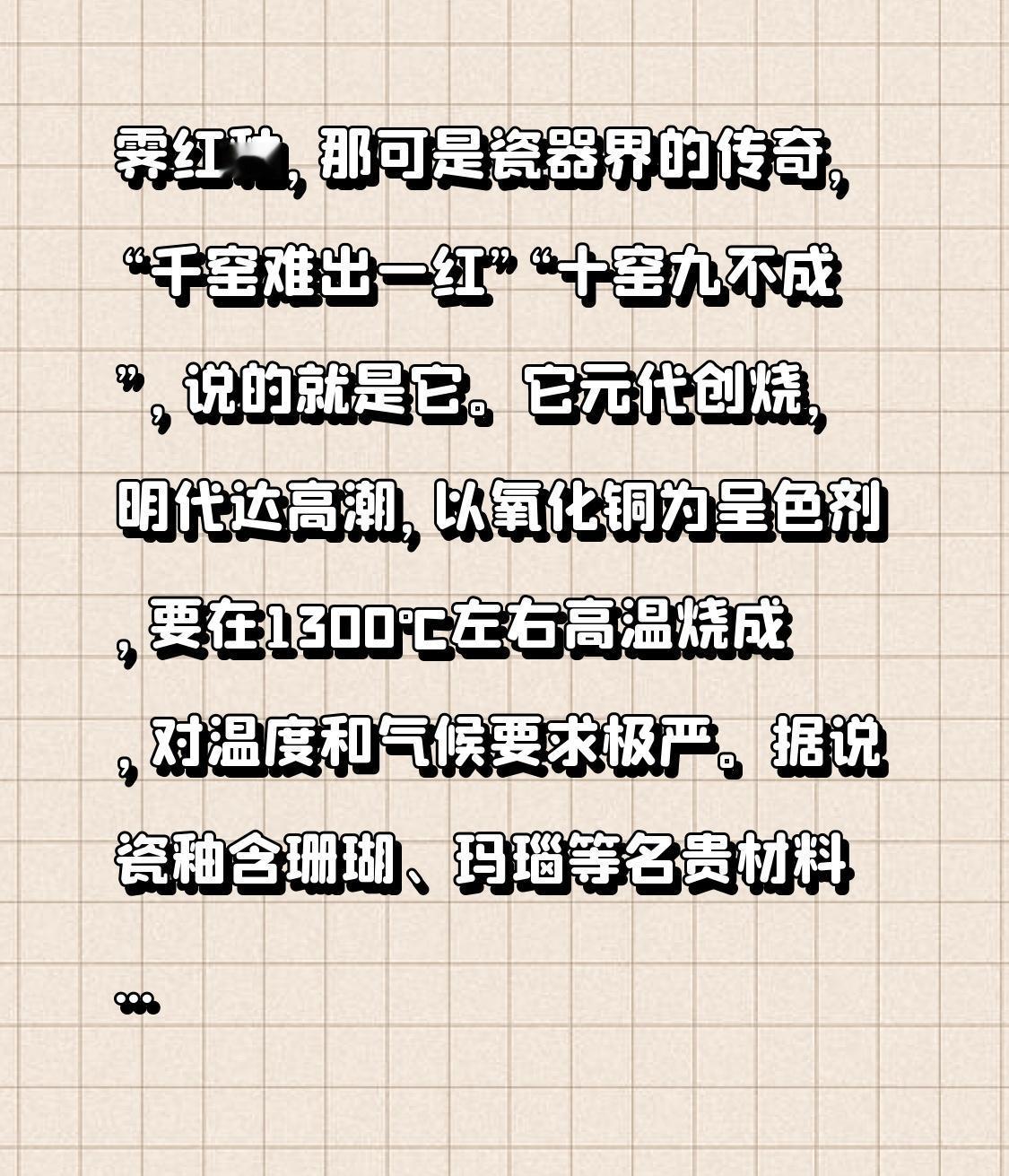 霁红釉,那可是瓷器界的传奇,“千窑难出一红”“十窑九不成”,说的就是它。它元代创烧,明代达高潮,以氧化铜为呈色剂,要在1300℃左右高温烧成,对温度和气候要求极严。据说瓷釉含珊瑚、玛瑙等名贵材料,烧制难度极高,被誉为千窑一宝,烧造方法还曾失传。 清代康熙时郎廷极奉旨复烧成功,唐英也烧制出华丽均匀的霁红釉。如今,2006年厦门日源实业攻关小组攻克了烧制难题,让红釉瓷价格大降。用现代技术复烧这几度失传的霁红釉,这场跨越千年的色彩对话,值得期待!