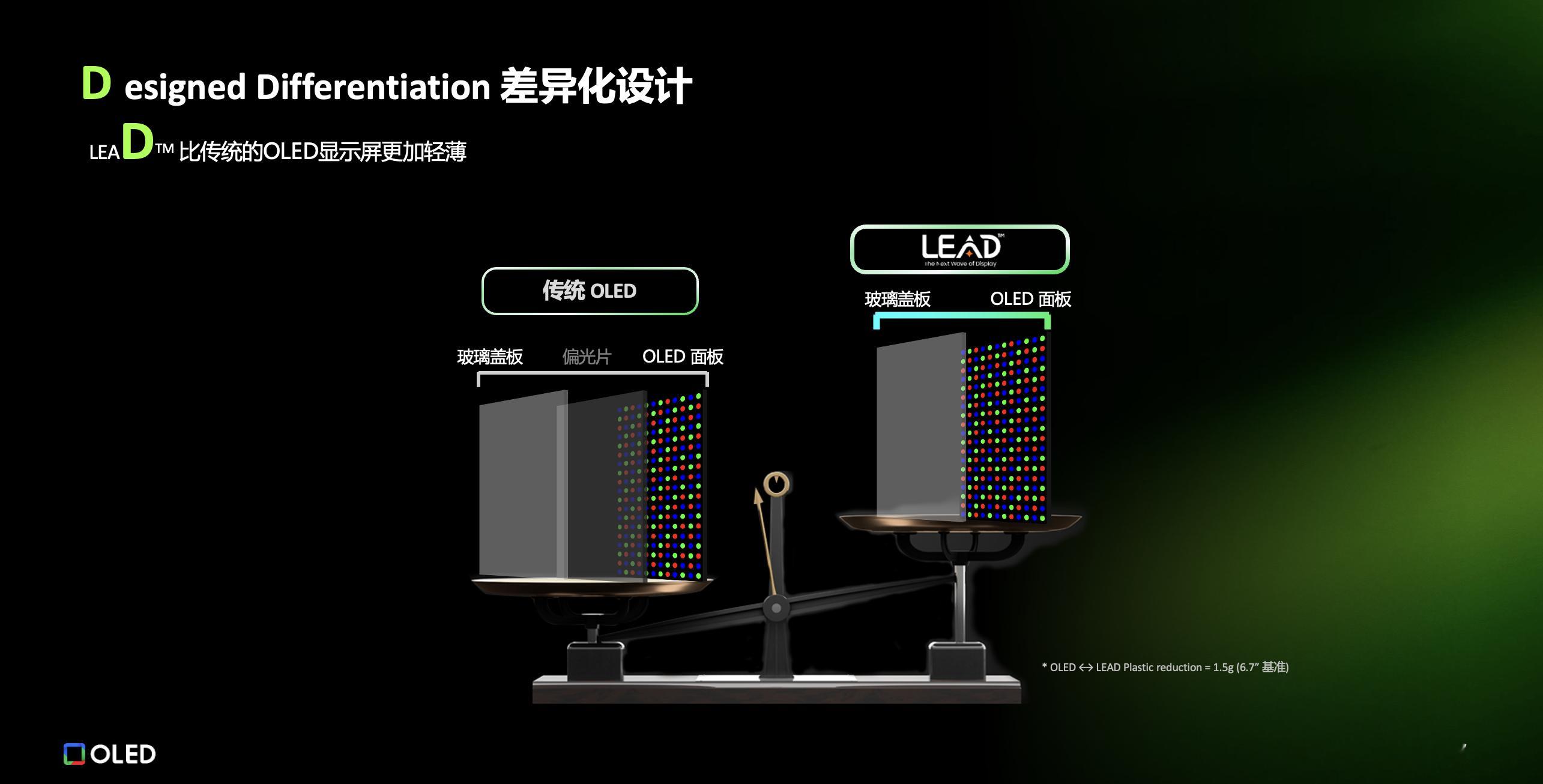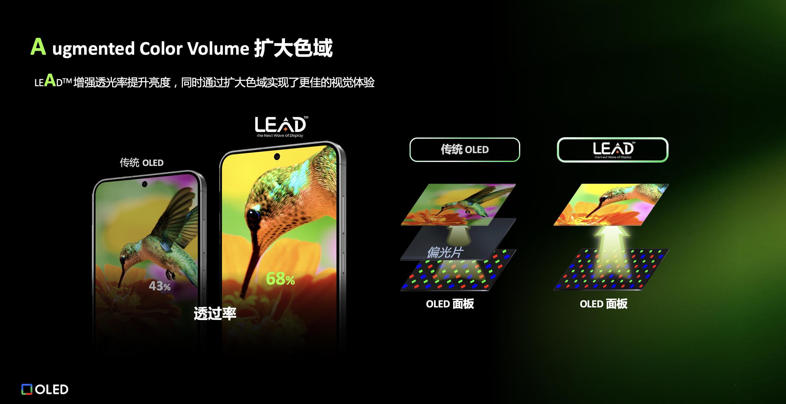 LEAD™ 的另一个特点就是它是没有偏光片的,屏幕透光率相比于传统 OLED 有很大提升,全屏峰值亮度最高可以达到 2600nit ,局部峰值亮度甚至可以达到 6000nit [哆啦A梦吃惊]LEAD™ 屏幕的色域覆盖也会更广,色彩还原准确,玩游戏或者看电影都能有更好的视觉体验。