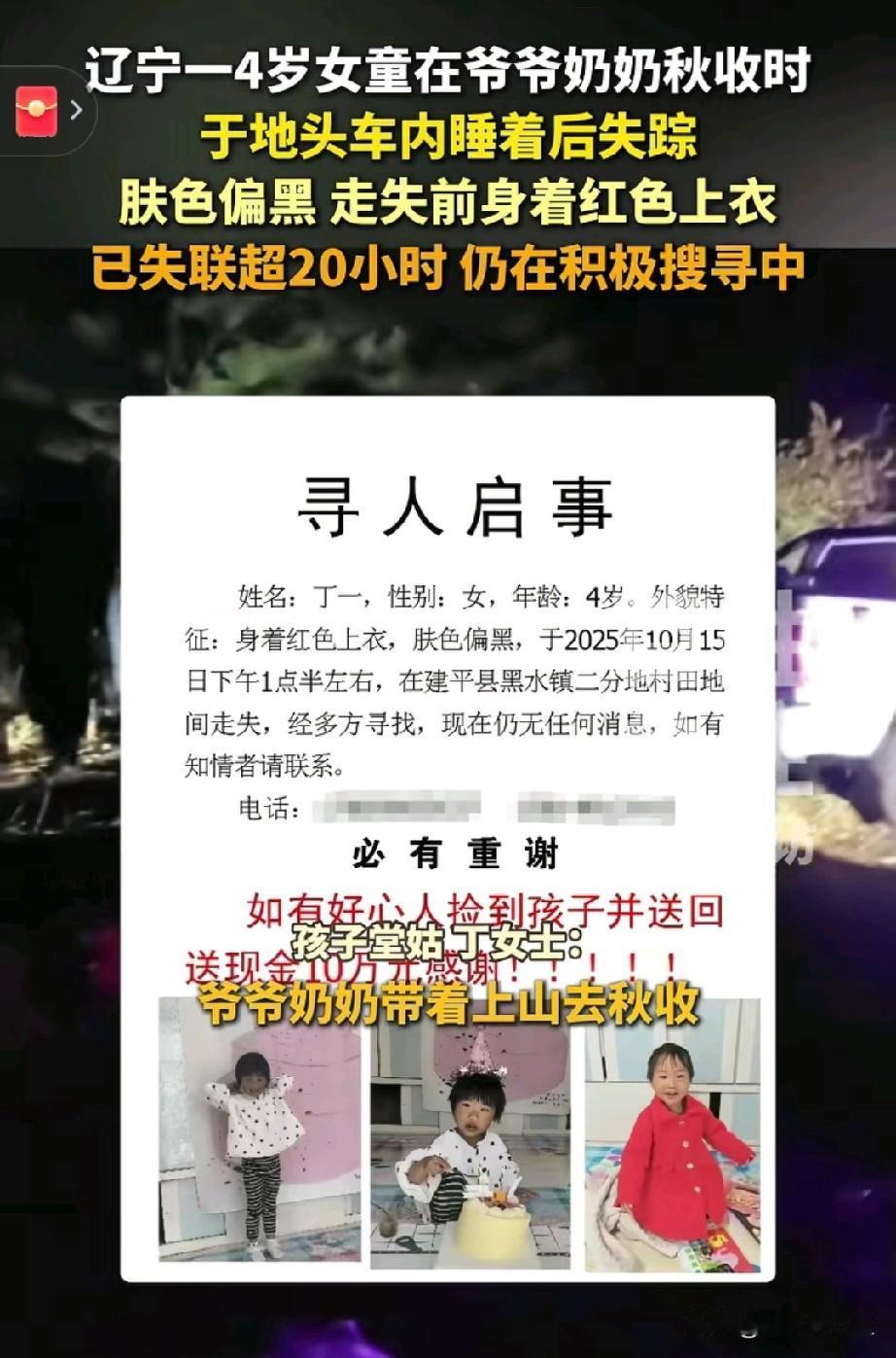 又丢了一个孩子!辽宁朝阳建平一个4岁的女童跟着爷爷奶奶上山去秋收,独自在面包车内睡了20来分钟人就不见了。 这事发生在10月15日下午1点半左右,女童丁一和爷爷奶奶上山秋收途中在车上睡着了,到了地方两位老人看孩子睡的正香便让孩子在面包车内睡觉,怕孩子被闷到,还特意将车窗放下一半,两位老人就去干活了。 车就停在干活地的地头,也没有遮挡,只要一抬头就能观察到,大约200米左右的距离,但是两位老人因为一直忙着干活,想着孩子又在睡觉,就也没一直关注车那边的情况。 大约20分钟左右老人回去看孩子发现孩子居然不见了。 老人赶紧联系亲戚朋友找人还报了警,让人感到揪心的是警方、救援队、志愿者出动了近千人寻找截止到现在依然没有找到孩子。 这事有网友猜测是遇到了坏人把孩子带走了也有网友觉得是孩子自己睡醒找不到爷爷奶奶自己走丢了。 我的老家就是朝阳的,说实话看到自己家乡有孩子丢了心里也格外的着急和心疼,毕竟孩子才4岁毫无生存能力。 现在正是秋收的时候,家家都很忙,对于从小生长在农村的我来讲完全能想象当时是个什么情况。 个人觉得孩子睡醒走丢的概率大一些,首先丁一平时就是跟着爷爷奶奶生活的,村里人基本应该都认识,而且在农村地里一般不会有陌生人的,有人也都是一个村的。 退一步讲真有陌生人要带走孩子,就从那半开的窗户神不知鬼不觉的抱走也不太可能,孩子被弄醒肯定也会挣扎大喊大叫的。 一般孩子刚睡醒都会找人的,200米说远不远,说近也不近,可能看不到爷爷奶奶就自己从车窗爬出去找人就这么走丢了,也可能跌落在哪里了。 不管怎么说这么小的孩子走丢对于家属来讲每一秒钟都是心急如焚的,现在才过24小时,还有机会的,希望能赶紧找到孩子吧,现在朝阳的早晚温度已经很低了,希望孩子能平安回来!