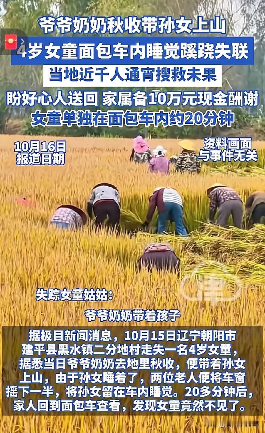 又丢了一个孩子!辽宁朝阳建平一个4岁的女童跟着爷爷奶奶上山去秋收,独自在面包车内