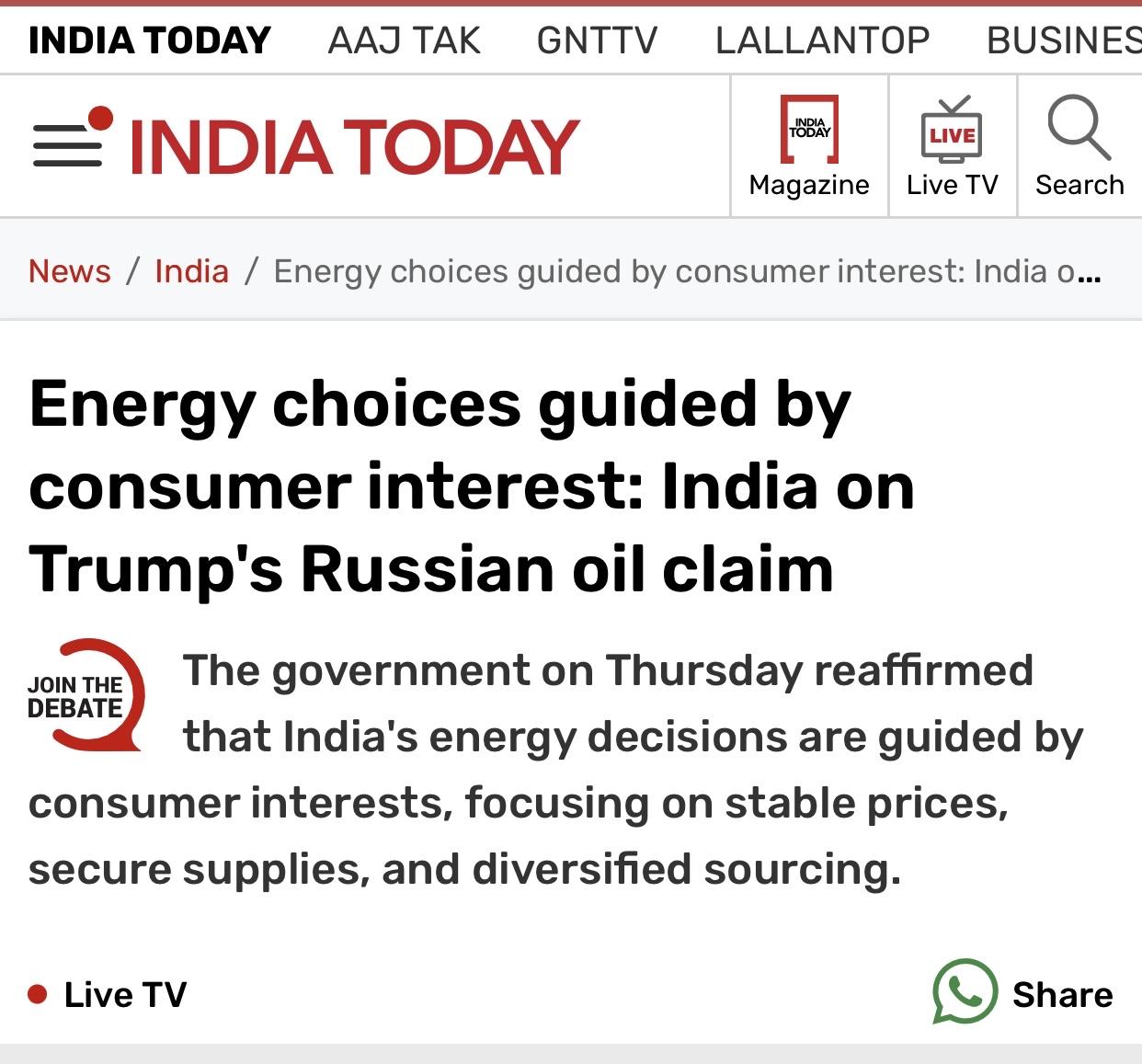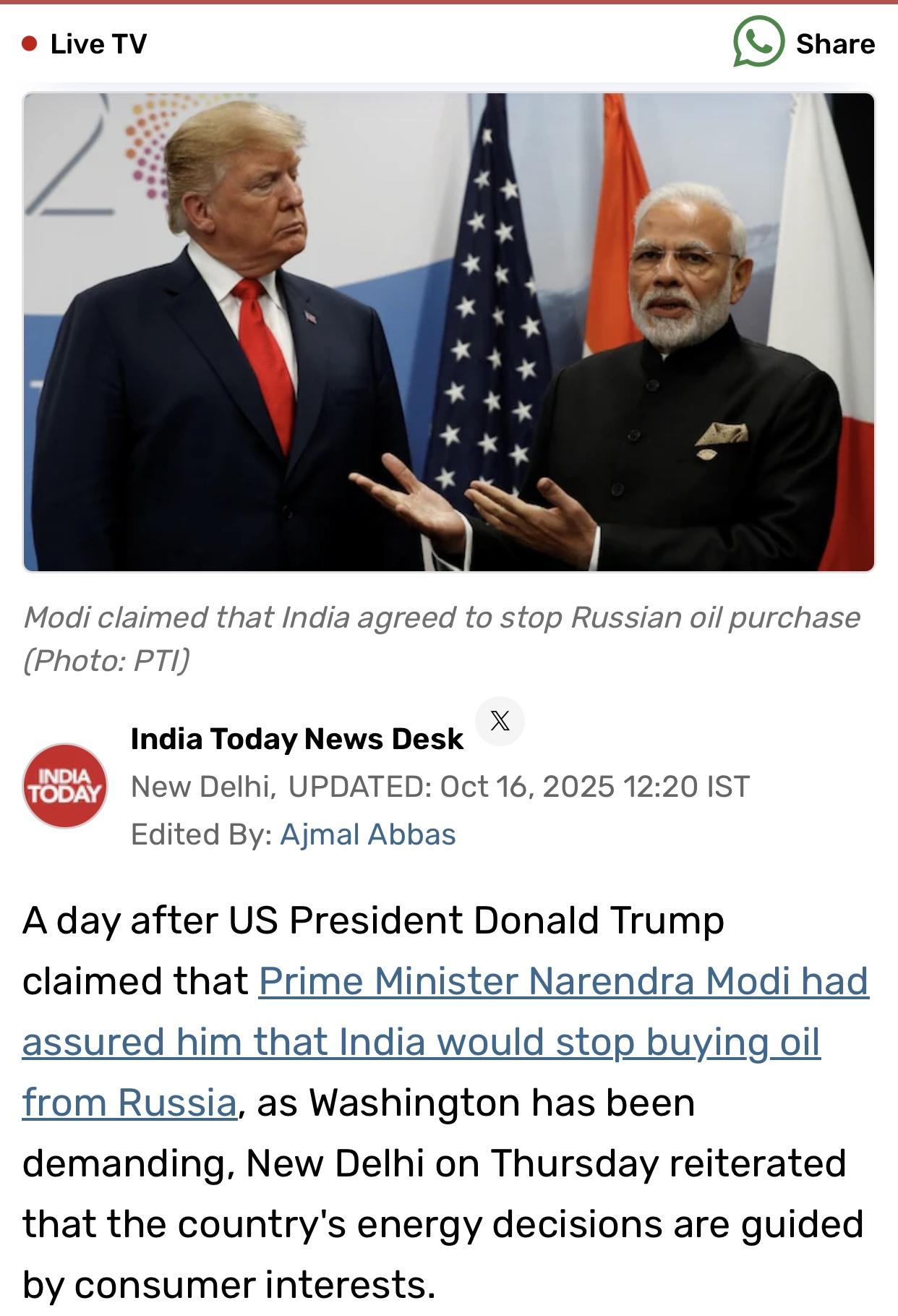 印媒:印度外交部回应特朗普言论,指”印度能源决策以消费者利益为指导” 印度《今日印度》官网10月16日报道:在美国总统特朗普声称总理莫迪向他保证,正如华盛顿一直要求的那样,印度将停止从俄罗斯购买石油后,新德里周四重申,能源决策以消费者利益为指导。 报道说,印度政府强调,确保能源价格稳定和供应是印度能源政策的双重目标,并强调决策是相应的指导。 印度外交部在一份声明中说:“印度是石油和天然气的重要进口国。在能源动荡的情况下,维护印度消费者的利益一直是我们一贯的优先事项。我们的进口政策完全以这一目标为指导”("India is a significant importer of oil and gas. It has been our consistent priority to safeguard the interests of the Indian consumer in a volatile energy scenario. Our import policies are guided entirely by this objective," the Ministry of External Affairs said in a statement)。 报道说,因俄罗斯石油占印度石油进口总量的三分之一,近几个月来,华盛顿方面一直在向新德里施压,要求其停止从俄罗斯进口石油。华盛顿方面认为,此举将限制莫斯科的经济资源,迫使其结束在乌克兰的战争。特朗普周三声称,“他(莫迪总理)今天向我保证,他们将不会从俄罗斯购买石油。这是一个重大举措。现在我们要让中国也这么做”。 报道说,在回应媒体关于”印度能源采购”问题评论时,政府明确表示:“确保能源价格稳定和供应有保障,一直是我国能源政策的双重目标。这包括扩大能源采购的基础,并根据市场条件进行适当的多样化”(In response to media queries on comments on India’s energy sourcing, the government affirmed, "Ensuring stable energy prices and secured supplies have been the twin goals of our energy policy. This includes broad-basing our energy sourcing and diversifying as appropriate to meet market conditions")。 关于是否扩大从美国购买石油,政府续说:“多年来,我们一直在寻求扩大能源采购。在过去的十年里,这一做法正稳步推进。(美国的)现任政府表示有兴趣深化与印度的能源合作。讨论正在进行中”。 报道说,然而,新德里没有直接评论任何关于从俄罗斯购买石油的决定,也没有评论特朗普声称莫迪总理终止购买俄石油决定的那种”保证”。此前,印度政府断然驳斥了此类要求,认为这些要求是不合理的,反映双重标准。 报道说,如果新德里决定削减与俄罗斯的石油贸易,这会代表印度的重大地缘政治和经济转变。印度已成为俄罗斯最大的石油客户,且利用西方对莫斯科制裁后的大幅折扣大量购买俄石油。特朗普政府于今年8月对印度出口征收50%的关税,大幅加大了对印度的压力,但几个月来,新德里一直坚定地捍卫其能源政策。政府坚持认为,其购买决策是以国家利益、能源安全和市场经济为指导,并始终表示,只要折扣率和物流“对我们最有利”,就将继续购买俄罗斯石油。 报道的原标题是《Energy choices guided by consumer interest: India on Trump's Russian oil claim》(印度评论特朗普的俄罗斯石油言论:以消费者利益为指导的能源选择)。