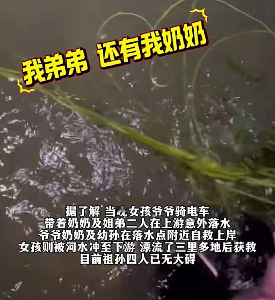 命大!10月15日,河南邓州5岁女童落水漂流3里地后被夜钓小伙救起,上岸第一句话:“我弟弟我奶奶也掉水里了!” 今天的事情让人感觉无比心酸!但好在有一个好的结果,那就是祖孙四人皆平安! 根据女孩描述:爷爷骑着电动三轮车带着奶奶和女孩姐弟俩,不慎翻入河沟后爷爷奶奶和弟弟自救上岸,而女孩则被冲向下游,在冰冷的河水中漂流了3里地才被夜钓小伙刘力和王佩救起。 女孩上岸后第一句话:“掉水里了,还有我的弟弟和奶奶。”女孩上岸后,第一句话就是惦念着弟弟和奶奶的安危。而四人落水后,其余三人皆能自救上岸,唯独女孩还黑暗和冰冷的水中随波漂流……只希望爷爷奶奶没有救起女孩是因为无能为力,而不是重男轻女。 无论如何,祖孙四人皆平安…… 无论如何,女孩平安……想必女孩大难不死,必有后福! 为刘力、王佩两位小伙点赞!好人一生平安!落水小孩 落水小女孩