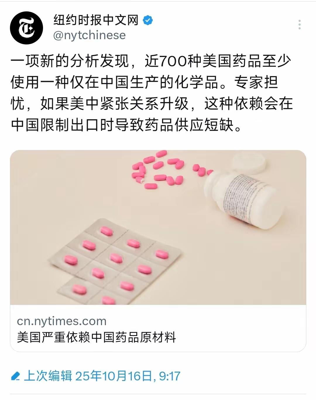 纽约时报:美国严重依赖中国药品原材料。 纽约时报中文网10月16日报道:“一项