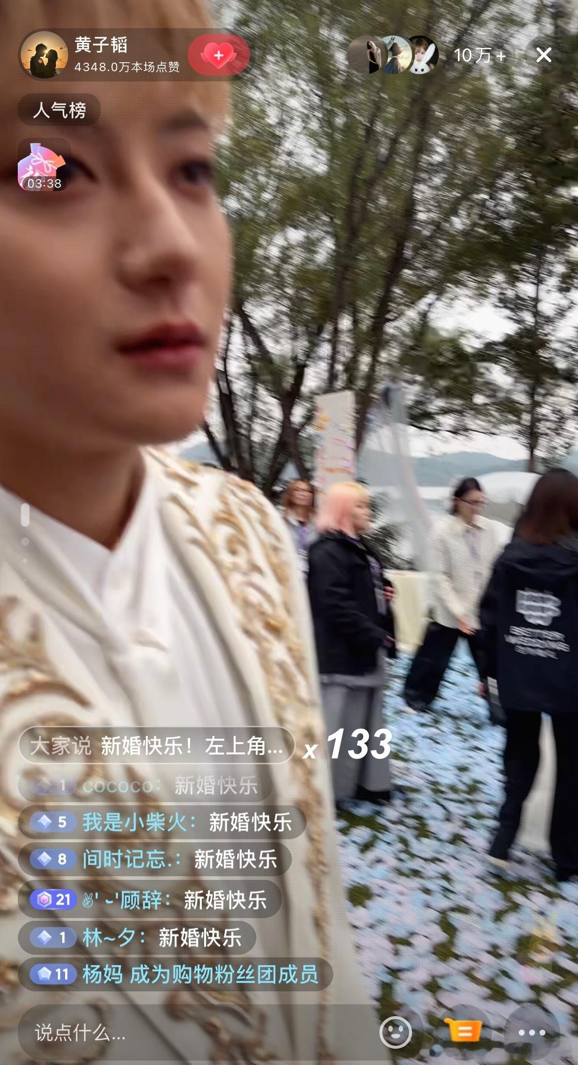 黄子韬徐艺洋婚礼直播,全屏都在扣新婚快乐,短短几分钟人数高达10w➕,这人气杠杠的