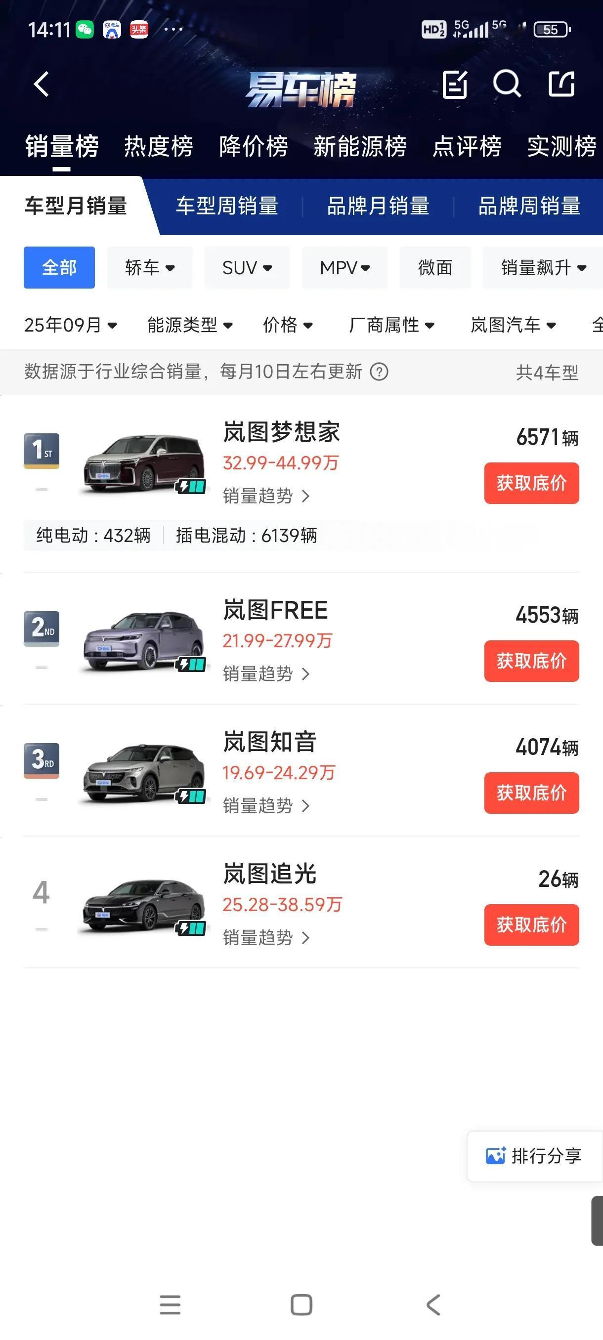 网传的9月华为系纯电销量榜单上的冠军是岚图知音,销量达3670辆。但是从易车网上