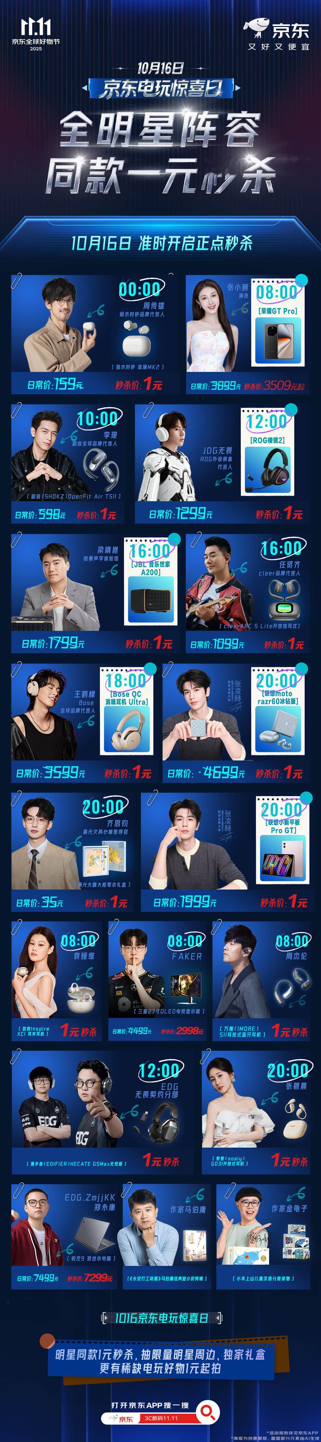 想和自家哥哥姐姐们用同款的粉丝们注意了,绝佳机会来了。10月16日京东电玩惊喜日,可以用1元秒杀的价格入手心仪已久的王鹤棣、吴磊、周杰伦、无畏等明星同款,让独处时光也闪闪发光。上京东app搜「京东电玩惊喜日」,手机电脑数码多重补贴低至五折,稀缺电玩好物1元起拍,10月16日下午16点,3C数码采销直播间超多福利,快来参与!京东11.11 又好又便宜 京东上线霉霉稀缺黑胶 京东拍卖80万的耳机