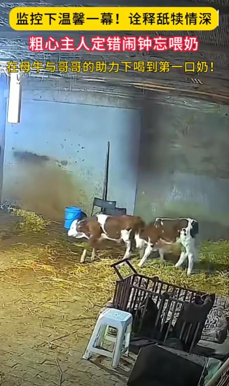 “万物皆有灵性!”黑龙江桦川县,养牛农户订错闹钟,忘记喂刚出生两天的小牛犊很爱,一觉醒来赶紧去牛棚查看情况,发现小牛犊已经卧在母牛膝下喝奶,随后男子调出监控,看到这令人动容的一幕! “我那天醒来突然想起来自己还没喂小牛,等我跑去牛棚一看,发现它已经在吃奶了,调出监控这才明白。” 眼前的养牛农户手舞足蹈地讲着自家小牛吃奶的过程,仿佛是自己的亲生孩子一般。 事情还要从几天前说起,这家农户养的母牛终于在怀胎几个月后要生产,怀着激动的心,养牛户喊来兽医来接生小牛。 可是天有不测风云,就在生产时,母牛体力不支,险些难产,好在旁边就有兽医,及时将小牛犊拉了出来,这才保住母牛和小牛的性命。 在鬼门关走了一遭的母牛和小牛都心有余悸,就连养牛农户也惊魂未定,因为对于他来说,牛已经不仅仅是挣钱的工具,更是一种精神寄托。 万幸母牛和小牛都活了下来,养牛户也十分欣喜,可是母牛身体受损严重,就连小牛走路也是颤颤巍巍,需要养牛户的协助才能勉强走两步。 于是养牛户又多了一个任务,负责给小牛喂奶,以确保小牛的营养,这样才能让小牛按时长大。 就在小牛出生的第二个晚上,养牛户本来定了一个凌晨的闹钟,怎料订错了时间,没有响,养牛户也一觉睡到天亮。 等到养牛户自然醒来,这才意识到,牛棚里的小牛还没喂,于是着急跑到牛棚查看情况。 一来到牛棚,养牛户被眼前的一幕惊呆了,原来小牛已经跪卧在母牛膝下,正在用力地喝着奶。 养牛户十分疑惑,因为生产的时候有点缺氧,兽医交代一定要照顾好小牛,它不能像正常小牛一样出生几个小时就学会行走。 于是养牛户也谨记兽医的教诲,还找出之前用的奶瓶,想着能够亲自喂养小牛。 但是眼前的一幕着实惊呆了养牛户,于是养牛户调出牛棚的监控,想要看看到底是怎么回事。 养牛户看着监控画面的一幕,不忍动容,只见母牛被自己用绳子拴在牛棚,活动范围十分有限,基本只能坐下和站着。 然而小牛和一只也是刚出生几天的小牛被放在柔软的稻草上,方便取暖,也可以有效防摔。 天蒙蒙亮,母牛轻声地叫着,想要召唤小牛来到身边,自己因为被绳子拴住无法主动靠近小牛。 小牛听到母亲的召唤睁开了眼睛,想要吃奶,可是母亲并不在身边,只有一个比自己大不了几天的牛犊在身边。 于是小牛缓缓站起,想要向母亲靠近,但是这段距离对于小牛来说太遥远了,它的四条腿都颤颤巍巍,连站立都是问题。 只见身后的小牛轻轻地用头顶着它,让他好一点点前进,母牛此时也哞哞地回应着,似乎是在鼓励小牛。 小牛在同伴的支持下,一步步向母牛靠近,步履蹒跚地走向母亲。 最终卧在母牛的膝下,大口地吸着奶,母牛也垂下眼睛,满眼慈爱地看着怀中的小牛。 对于这件事,大家有什么看法呢?欢迎大家评论区交流讨论。 信息来源:(桦川印象 2025-5-2 错过了闹钟,未错过爱:初生牛犊在亲情的助力下喝到第一口奶!)