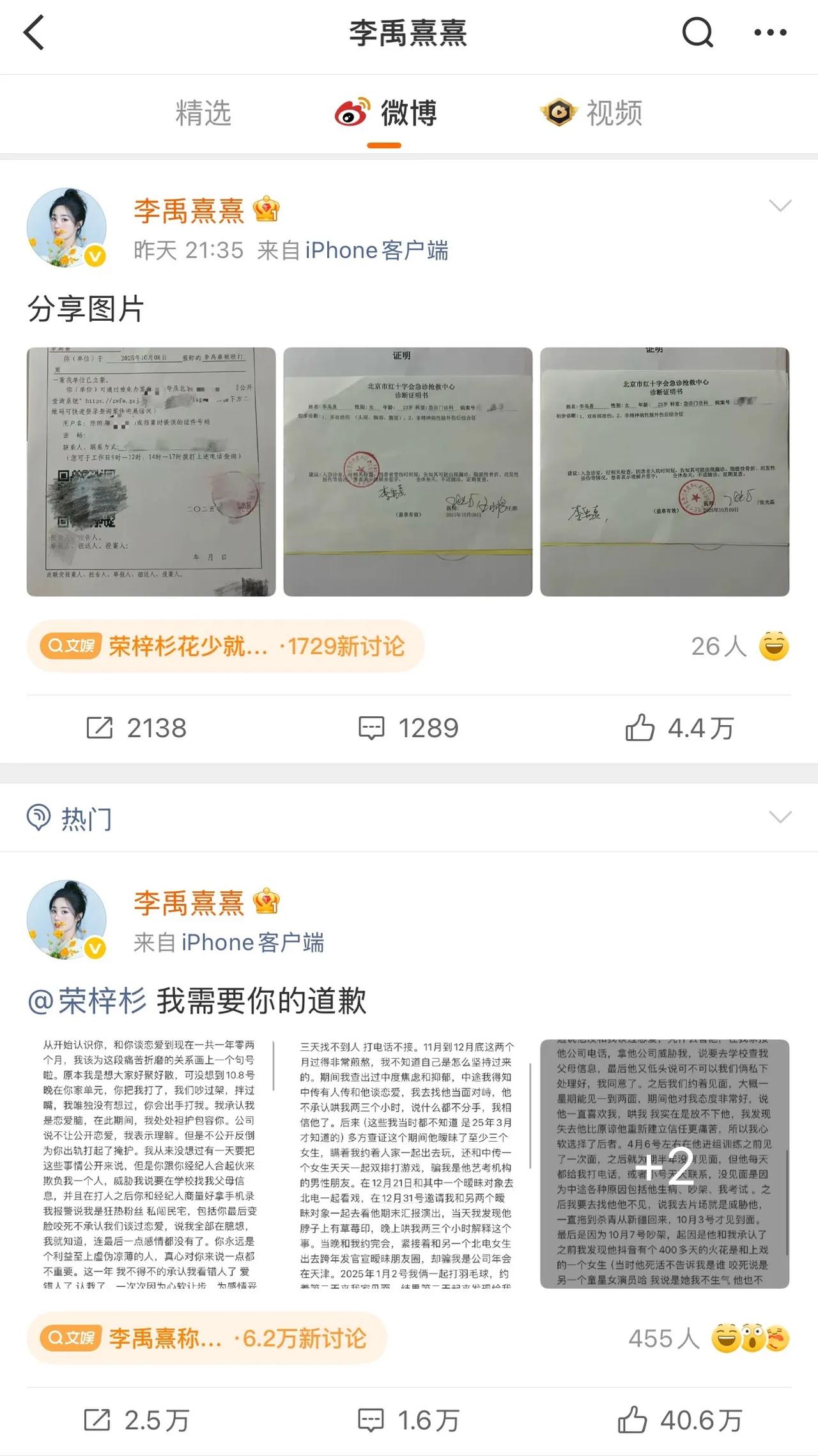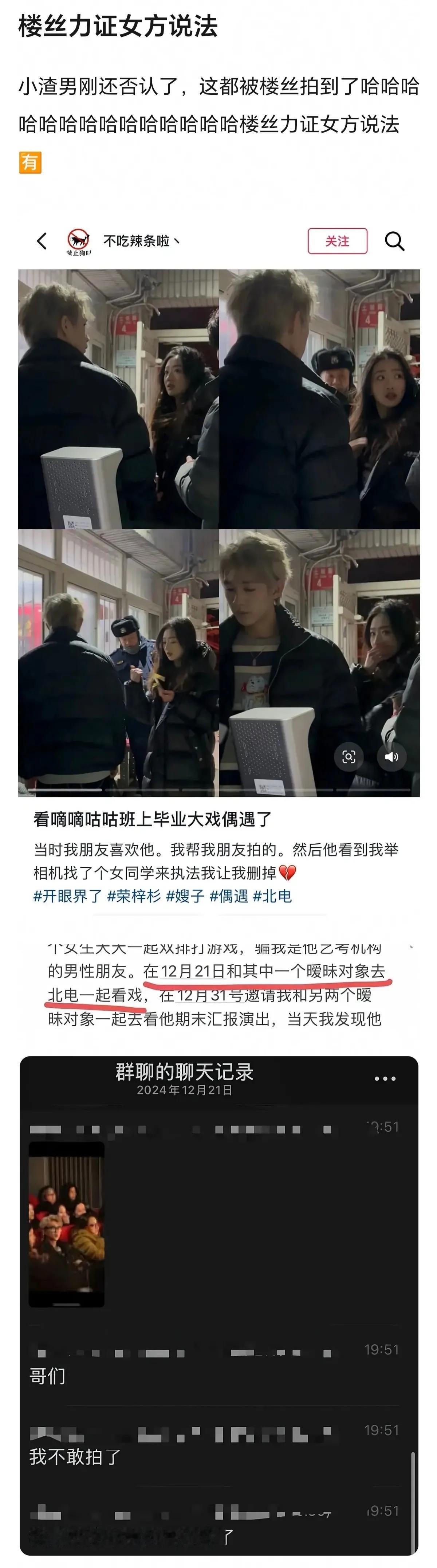 陈好让荣梓杉在大学一定要谈恋爱,他是真听进去了,但是也没让他跟这么多人谈啊…… 10月15日,新人演员李禹熹在社交平台发文称与荣梓杉已恋爱一年多,并指责其在恋爱期间出轨打人。 李禹熹透露荣梓杉在恋爱三个月后开始冷.暴.力,期间与至少3名女性暧昧(中传、北电女生)。2025年10月8日她前往荣梓杉住所沟通时,遭其拎摔两次、脚踹致头部肩部受伤,还被威.胁要去学校找父母的联系方式。她因其一度确诊中.度.焦.虑和抑郁,并晒出了就诊证明,喊话荣梓杉出来道歉。 随后荣梓杉工作室发文否认,声明中称艺人与李某某从未建立恋爱关系,更不存在所谓“恋爱”“出轨”等虚假事实。女方长期跟踪、蹲点,偷拍艺人视频等强.迫艺人承认两人有交往经历,目前荣梓杉工作室已报.警。 荣梓杉否认与李禹熹恋爱,没想到转头被网友晒图打脸了。网友偶遇他带女方去北电看戏,看到有人在拍他,还要求删除照片。 这孩子居然都已经长到恋爱出轨的年纪了,我对他的印象还是朱朝阳[捂脸]去年看花少就有不少人吐槽荣梓杉的迷惑行为,除了吃喝玩就是手机不离手,当时以为年纪小不懂事,现在知道他为什么老玩手机了!