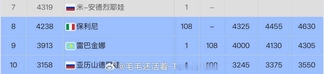 安德列娃:4319 (宁波已淘汰,起记分1分。)如果莱巴金娜宁波没进四强,就直接入围。
