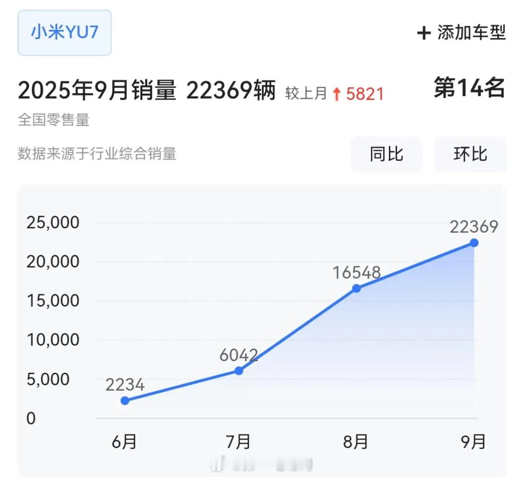 YU7销量22369辆,环比增35.2%,首入总榜TOP15