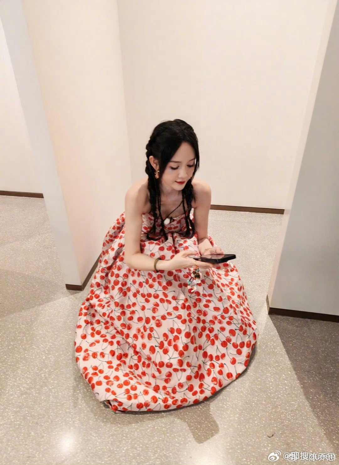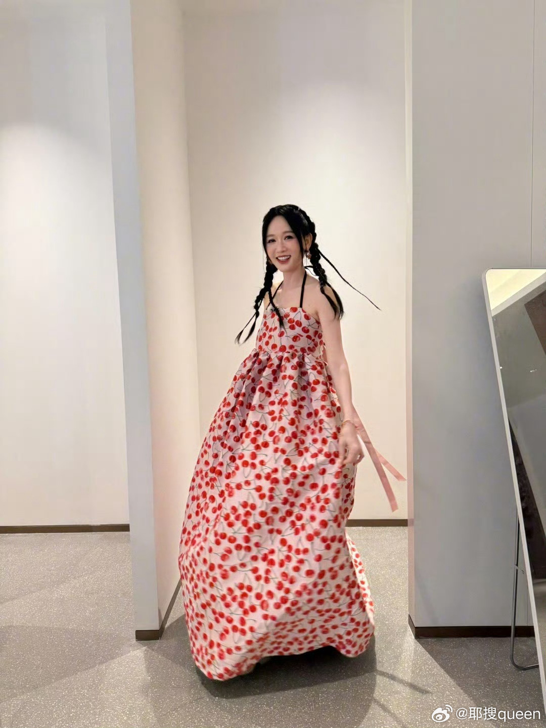 樱桃裙配麻花辫,甜美俏皮又优雅,笑容明媚,乔恩姐这状态太好了!