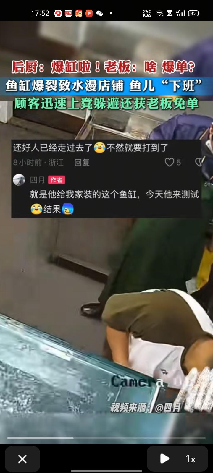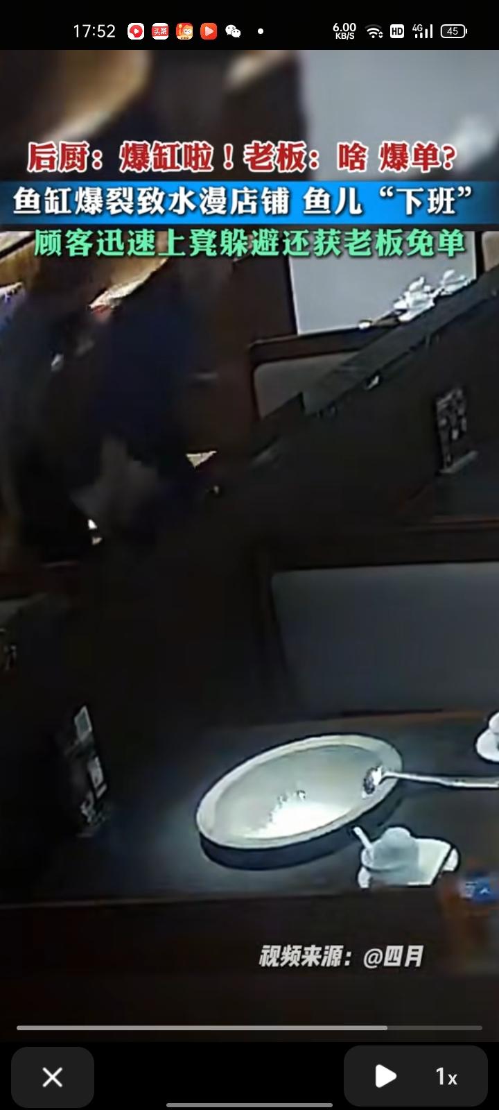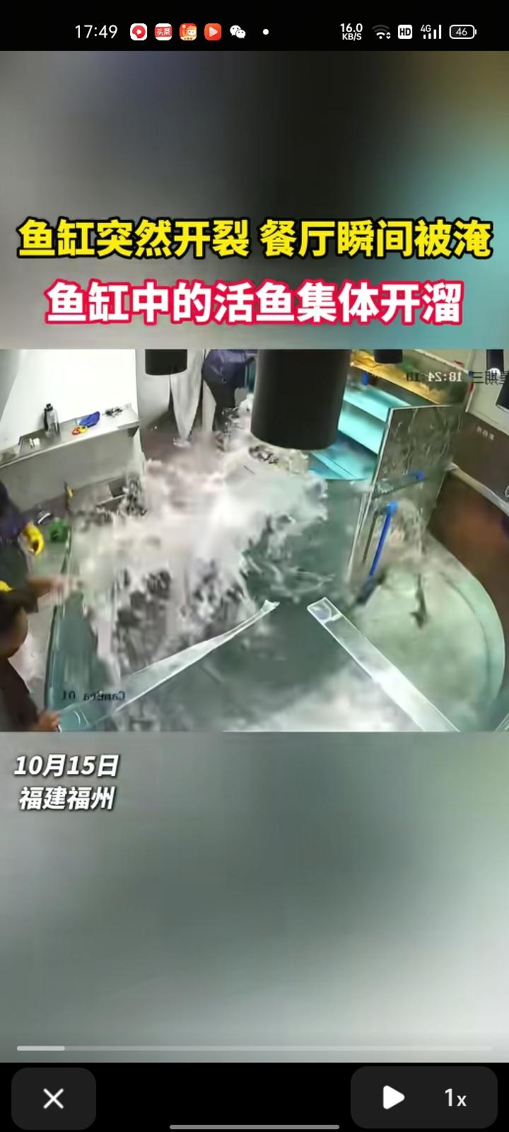 10月15日,福建福州。监控画面显示,餐馆内鱼缸不知什么原因爆裂,鱼缸里的活鱼集体开溜,员工吓得不知所措。 据了解,该餐厅主要售卖蒸汽石锅鱼,全部采用现杀现做的做菜方式。鱼缸爆裂时餐馆有顾客在用餐,餐厅老板随即做出集体免单的决定。