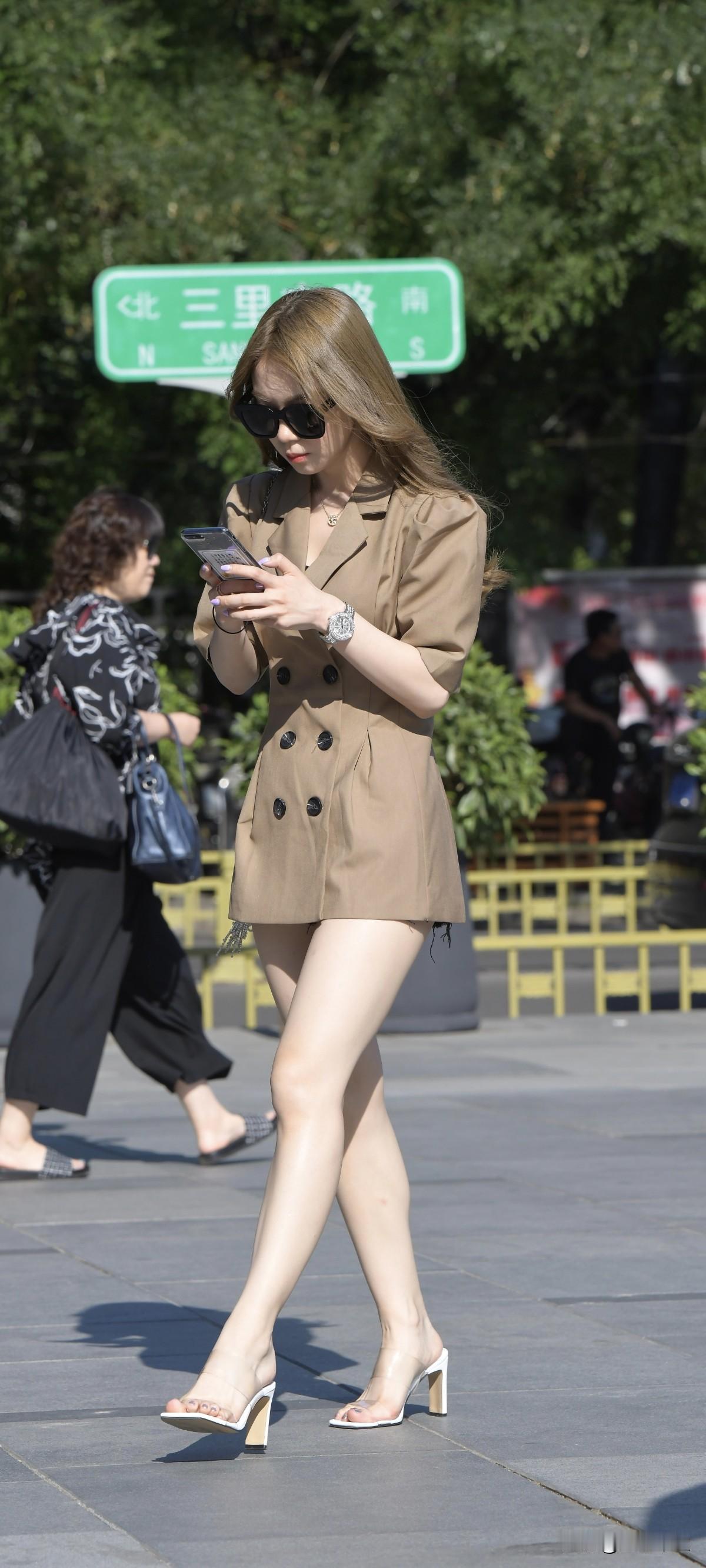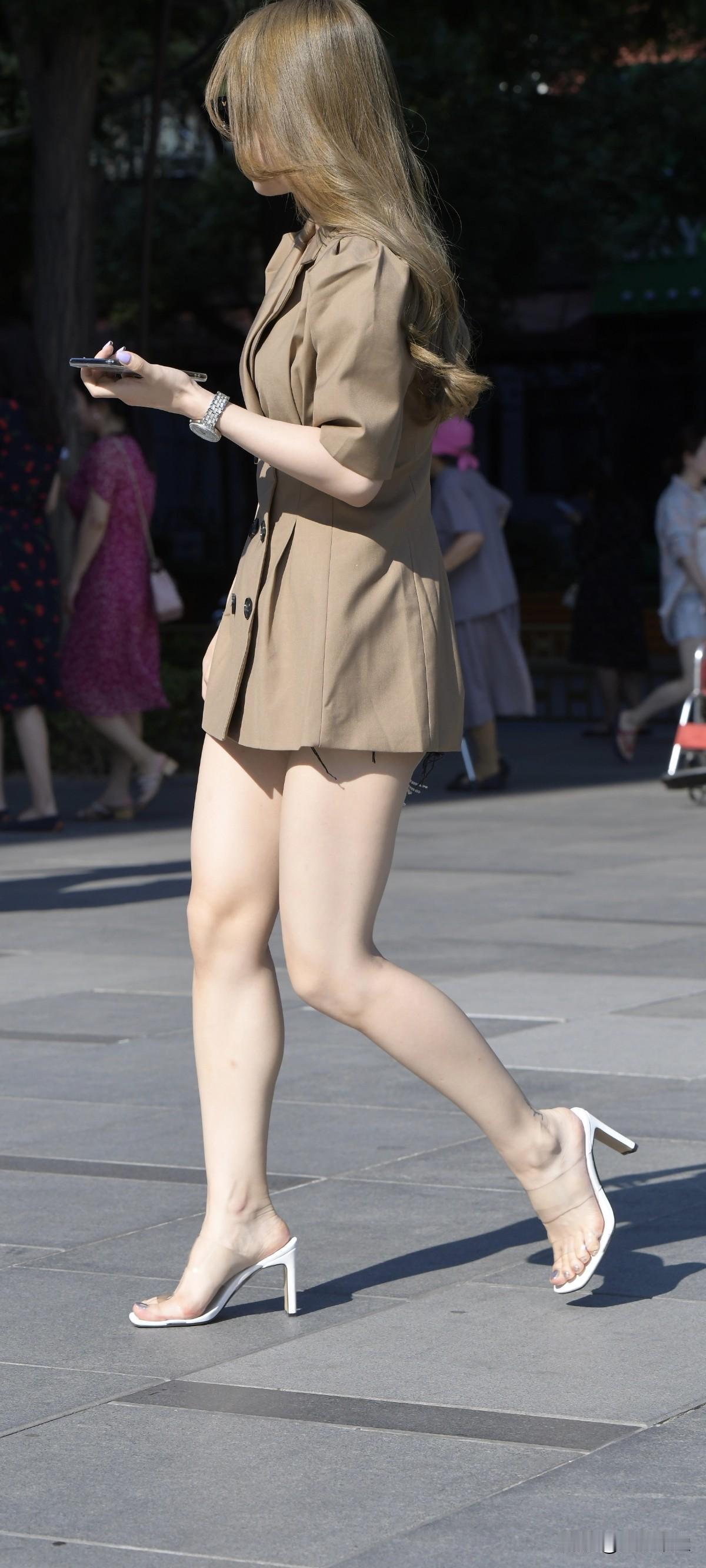咖啡色西装外套消失装搭配透明高跟鞋墨镜小姐姐 !!!分享街拍小姐姐