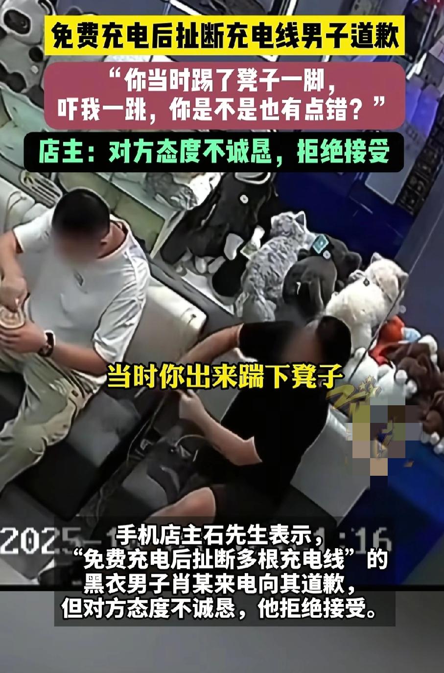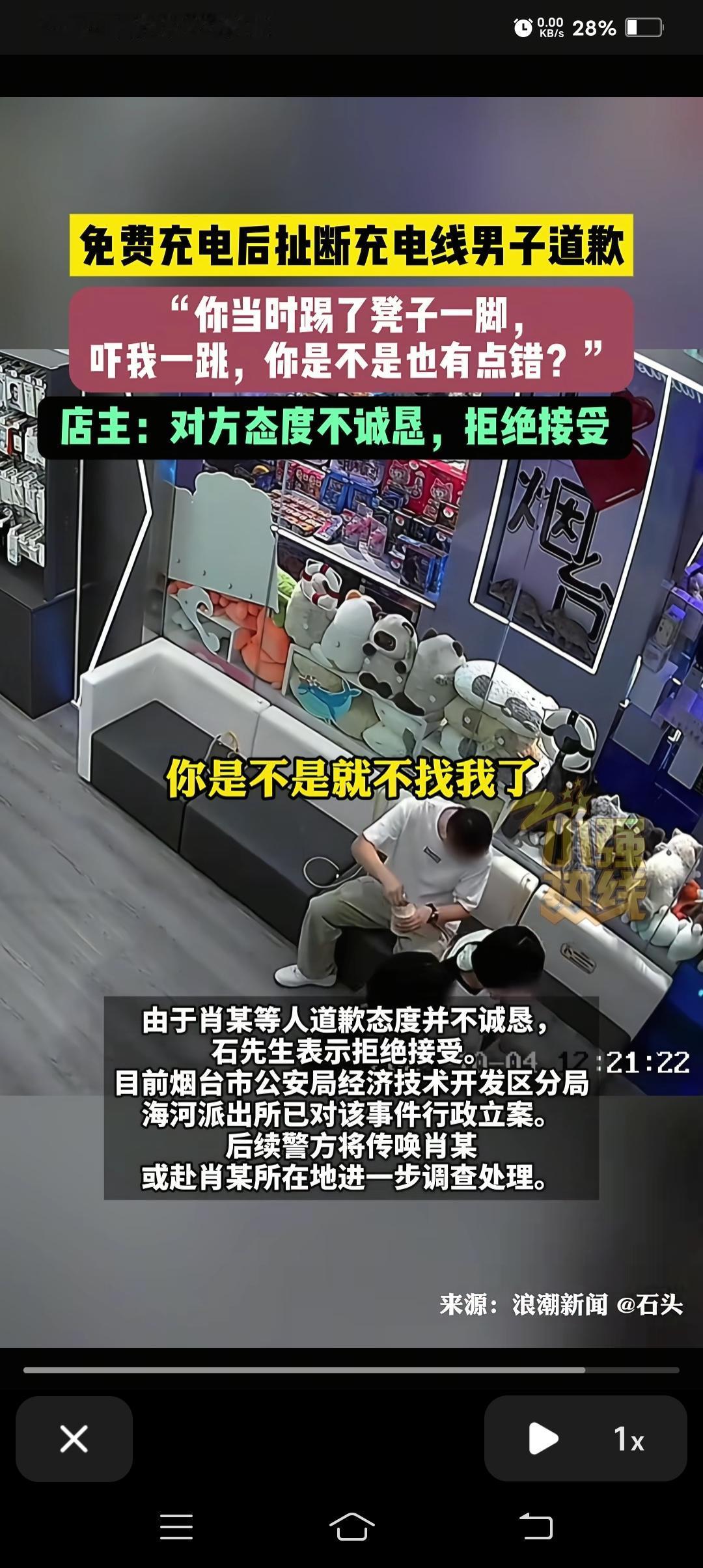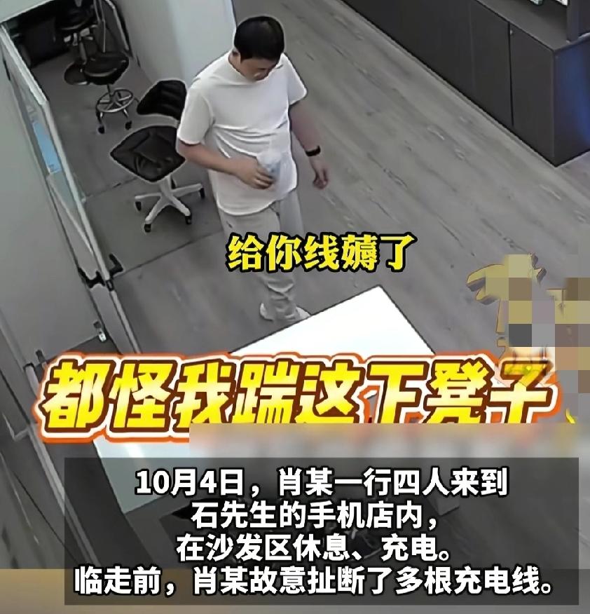 现在全网最烦恼的人应该就是那个肖某了,手机店老板免费提供充电场所,你不但没有一点感谢的意思,还把人家的电线给扯断了,把店主气的都没睡着。 事后肖某向店主打电话道歉,如果他态度诚恳点或许店主就能原谅他了,可他反而指责是店主踢凳子先吓着他了,他生气把人家电线薅了,这理由说出来连自己都不信吧?店主踢凳子是因为凳子本该是放在桌子下面的,这难道也是错吗? 还有那个白衣女子,往人家沙发缝里塞东西不说,还说店主是故意找人发视频网曝他们,还辱骂店主,并扬言要找律师起诉店主。真是应了那句话“物以类聚,人以群分。” 这就是恶人先告状,对比烟台海河派出所已立案,会随时传唤肖某。