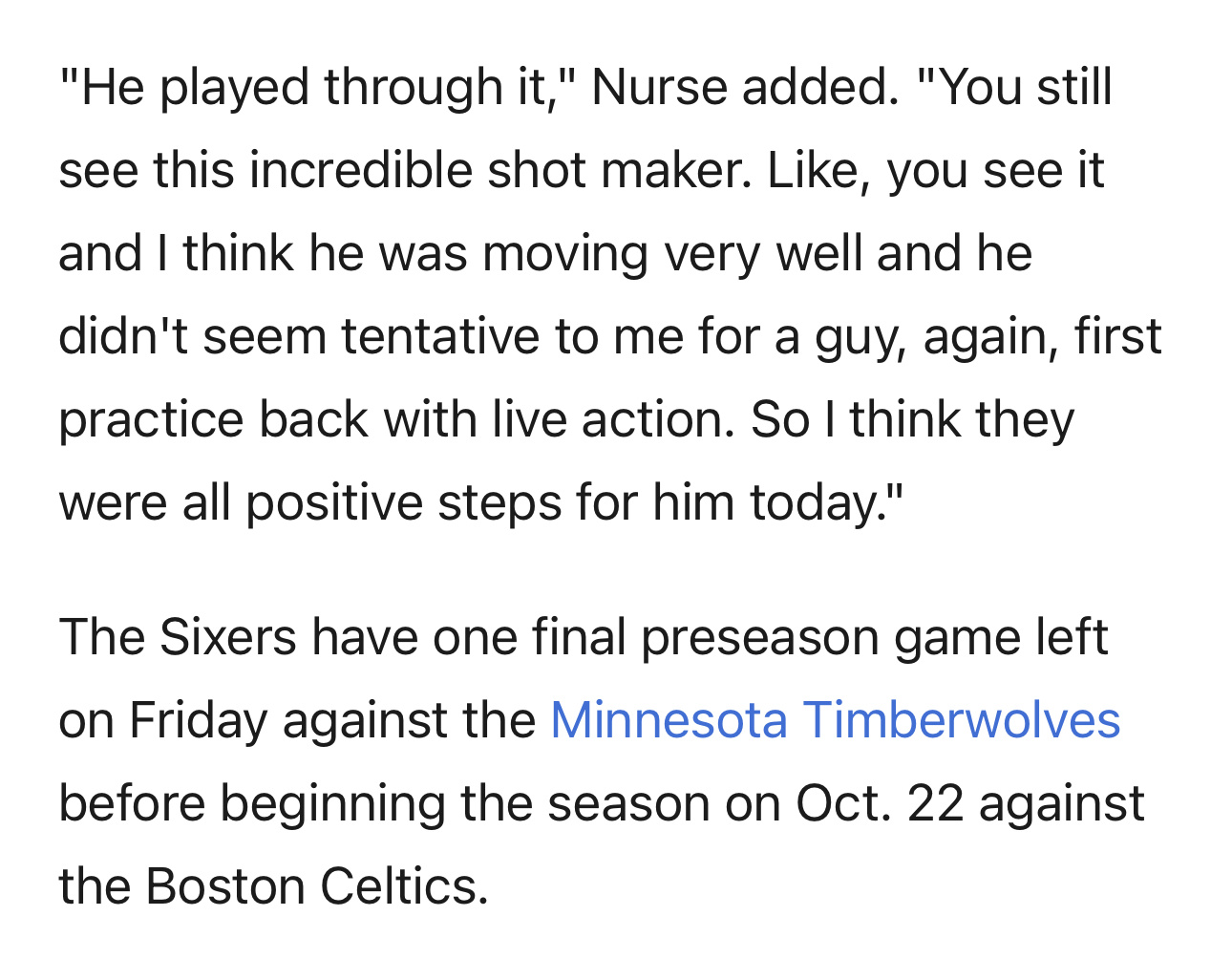 费城76人队还剩下最后一场季前赛,将于(北京时间)周六对阵明尼苏达森林狼队,随后他们将在10月23日迎来新赛季首场常规赛,对手是波士顿凯尔特人队。