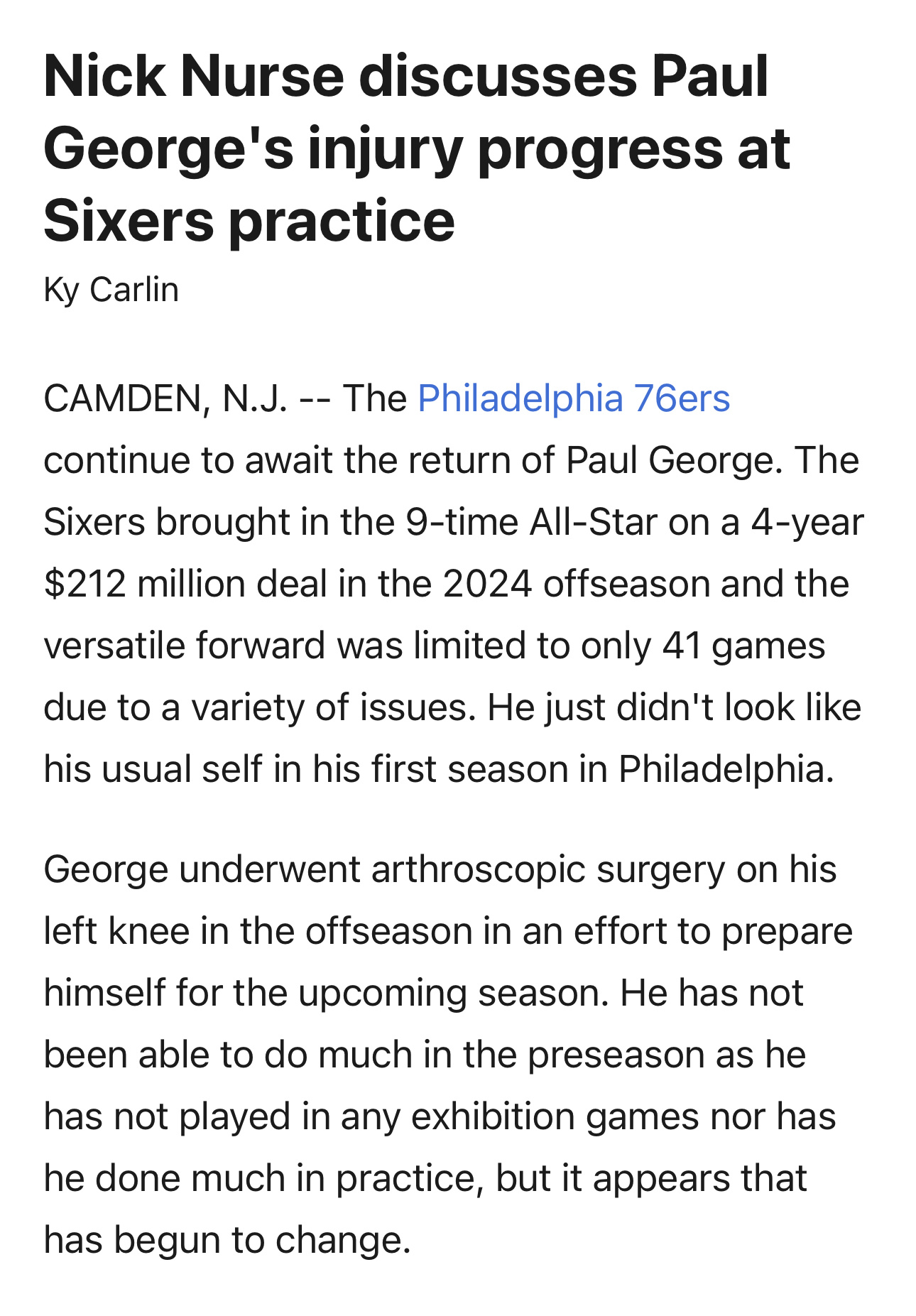 为备战新赛季,乔治在休赛期接受了左膝关节镜手术。整个季前赛阶段他始终受限——既未参加任何赛事,也未参与大量训练,但近日情况似乎出现转机。