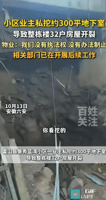 “万万没想到!”安徽六安,一小区业主为了一己私欲,竟私下开挖了300平方米的地下室,等大家发现时,整栋楼32户房屋都已经开裂了,楼里的居民全都人心惶惶的,在得知真相后,他们都被该业主的疯狂行为给震惊到了! 来源:【百姓关注】 这起令人震惊的私挖地下室事件,就发生在安徽省六安市霍山县的景秀蓝湾小区! 业主黄某松在未经任何部门批准的情况下,于2025年7月3日开始违规在其购买的门面房开挖地下室! 为了不让邻居和物业发现,黄某松采取了极其隐蔽的施工方式! 业主包女士描述,施工期间全部用3米多高的围栏围起来,工人进去施工门就锁起来,出来之后也锁起来,所以其他业主很难发现! 更令人惊讶的是,施工方采取了 “昼伏夜出” 的策略。他们白天用挖机在里面挖,到了下半夜,偷偷把一车车土往外面运。这种类似“蚂蚁搬家”的方式让他们在相当长的时间内未被发现! 直到8月17日,一位住户白天回家给孩子做饭时才注意到这一幕。居民们随后向有关部门报告,相关部门到现场责令施工人员停工! 但施工人员还是偷摸施工,直到居民报警,施工才彻底停止! 这栋楼高9层,临街一楼和二楼是门面。目前,楼栋住进了24户,总共有32户。破坏不仅限于低层,而是从下至上贯穿整栋楼。即使是住在顶楼9楼的包女士家,墙面也出现了各种裂缝。面对如此严重的违法行为,相关部门迅速采取了行动! 根据霍山县联合调查组发布的《情况通报》,涉案业主黄某松已于8月21日被公安机关依法刑事拘留,9月19日被执行逮捕。 当地政府部门已经介入处理。霍山县住建局、城管局和相关部门工作人员表示,霍山县对此事高度重视,已成立联合调查组,对涉事人员立案调查。 9月1日,房屋基础加固工程完成,并通过县住建局组织的验收。截至目前,房屋结构安全各项监测数据均在正常值范围之内! 然而,即使责任人已被逮捕,32户居民的心灵创伤和财产损失却难以完全弥补,即使现在房屋加固完成,但这栋楼所有居住单位居民,他们的心里始终会存在担忧!
