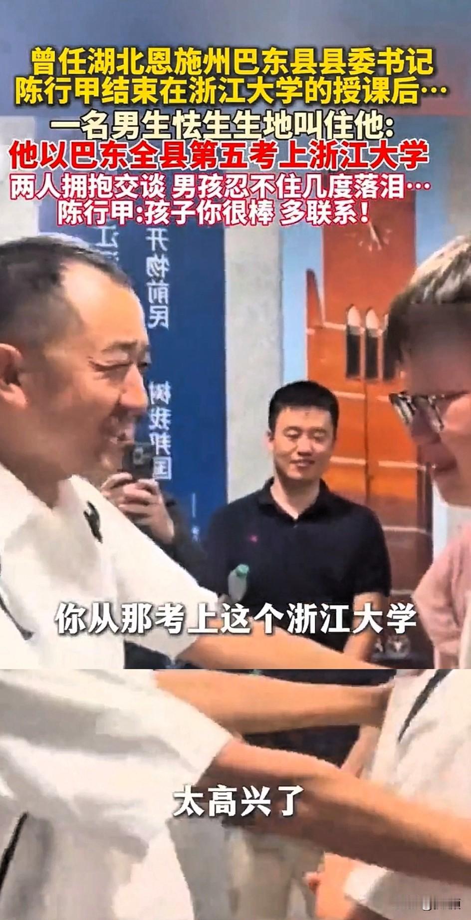 “浙大又火了”, 这次火的不是啥科研突破, 而是一场温暖人心的相遇。在浙大 礼堂,一个来自巴东的男孩向东升,找到了陈行甲。一见面,话还没说几句,眼圈就红了,两人一抱,男孩更是忍不住落泪。这泪,是巴东孩子一路走来的艰辛与不易啊! 巴东,那地方过去条件有多差,知道的人都懂。可就是这样一个地方,走出了考上浙大的向东升。他的名字里带着光,现实中也真的争气,背后是无数个熬夜刷题的夜晚。陈行甲没问成绩,只一句“我知道那地方的孩子有多拼”,就让人心里暖洋洋的。 这世间,最动人的莫过于被看见、被理解。向东升的泪,是委屈,更是喜悦。